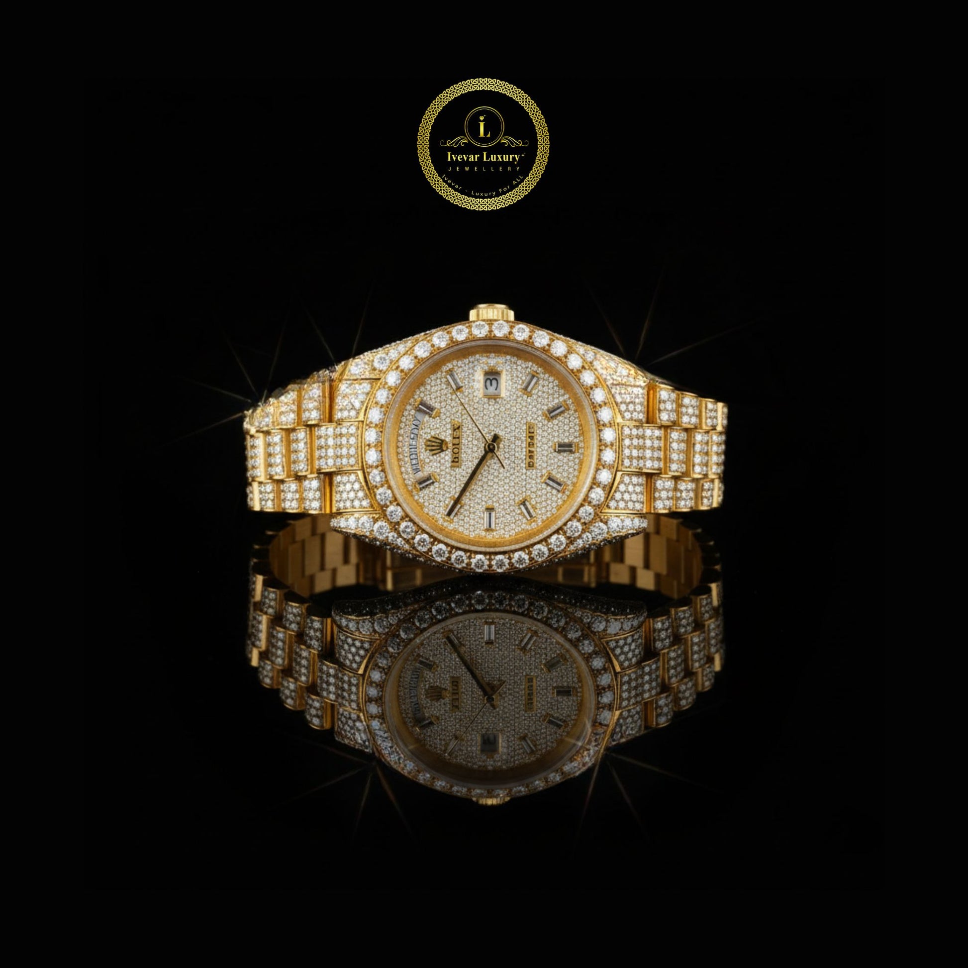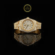 An extraordinary creation of brilliance and prestige, this Exquisite Yellow Gold Fully Iced-Out Diamond Timepiece epitomizes the art of luxury watchmaking. Every surface—from the meticulously pavé-set dial to the dazzling round diamond-encrusted bezel and bracelet—radiates unmatched opulence and craftsmanship. The warm glow of yellow gold enhances the luminous sparkle of each hand-set diamond, creating a captivating harmony of light and elegance. Designed for the connoisseur who commands attention, this timepiece unites precision engineering with high jewelry artistry, standing as a true symbol of power, sophistication, and timeless allure.