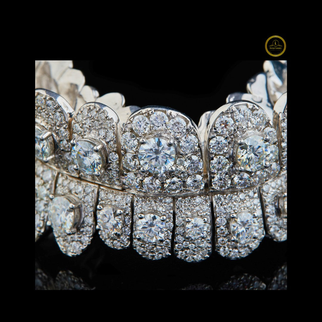 This piece is a magnificent example of "iced out" custom grillz, designed for luxury street style. It features brilliant, high-quality Moissanite stones, a popular and more affordable diamond alternative known for its exceptional fire and sparkle (often surpassing that of natural diamonds).