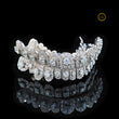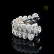 The grillz appear to cover multiple upper teeth in a full-set style, utilizing a dazzling, dense setting—likely pave or cluster—to maximize shine. They are custom-made, ensuring a perfect fit, and typically crafted in precious metals like sterling silver, or white gold (the color suggests a white-metal finish). Moissanite offers durability and an intense visual presence, making this a bold, fashionable, and eye-catching statement piece.