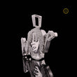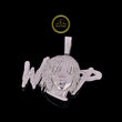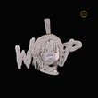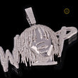 The pendant is completely iced out in a silver-toned metal, with every visible surface, including the hair and surrounding text, fully paved with brilliant Moissanite diamonds. The meticulous pave setting is used to define facial features and the texture of the hair. This piece is a quintessential example of high-impact, figurative custom jewelry, designed for maximum shine and immediate recognition of the person depicted.