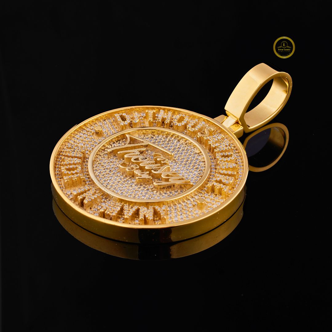 luxurious custom pendant, likely crafted from gold-plated or solid gold metal. The design is a large, circular piece heavily embellished with pave-set lab-grown diamonds, offering a high-carat, brilliant appearance at a more accessible price point than lab grown diamonds.