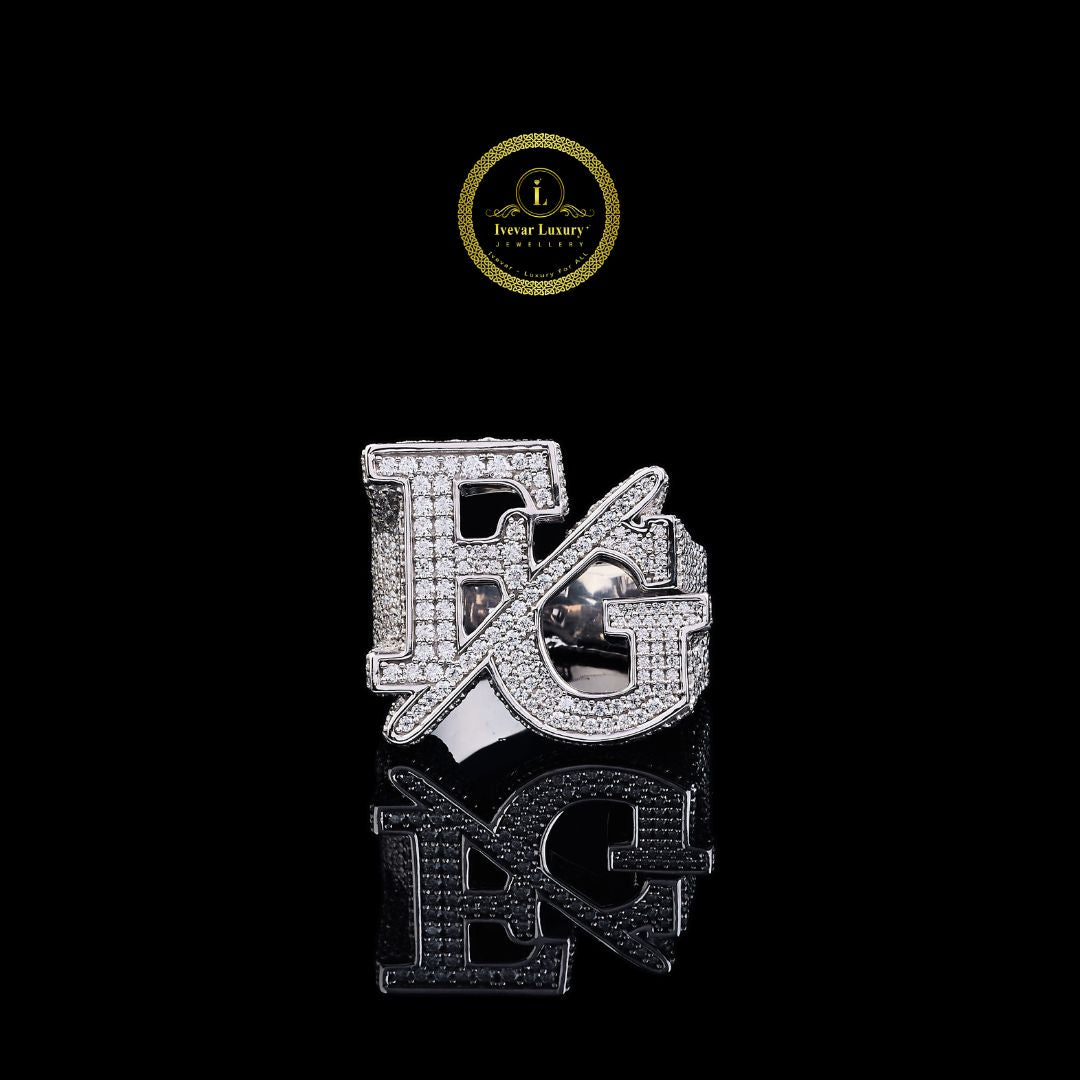 This custom FG initial ring by Ivevar Luxury is a high-impact statement piece designed for maximum "iced-out" brilliance. Crafted with meticulous detail, it features the letters "F" and "G" in a bold, interlocking block font, entirely pavé-set with VVS-grade Lab Grown stones.