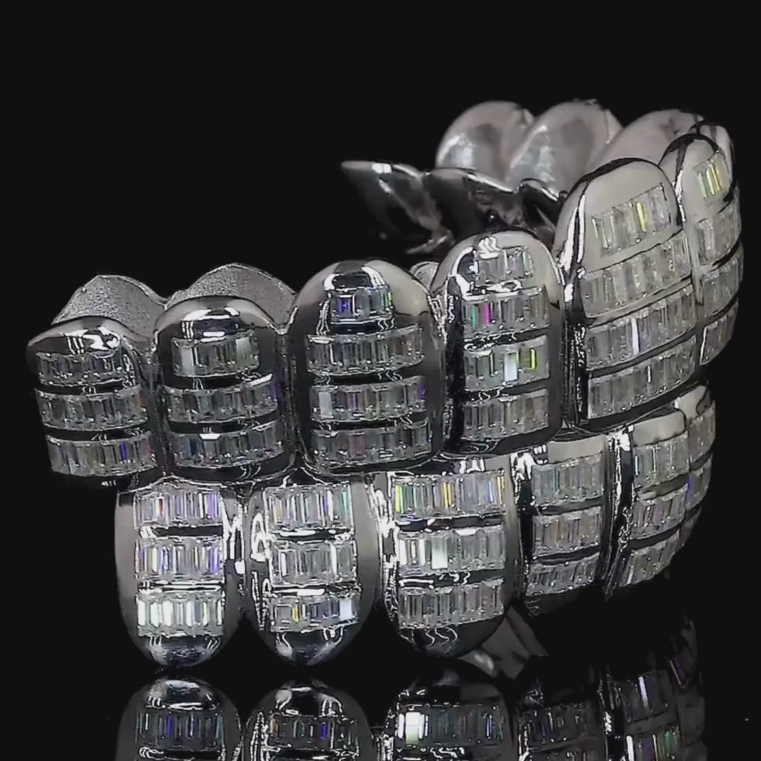 Custom grillz for the upper and lower teeth, crafted from a brilliant white precious metal (likely white gold or silver). The design is fully iced out, featuring numerous meticulously placed baguette-cut lab-grown diamonds. Lab-grown diamonds offer superior clarity and brilliance with an ethical source and accessible price point. Each stone is set in a secure channel or invisible setting to create a seamless, high-impact surface of continuous sparkle. As a custom piece, these grillz are molded specifically for the wearer's bite, ensuring a comfortable, secure, and striking luxury accessory.