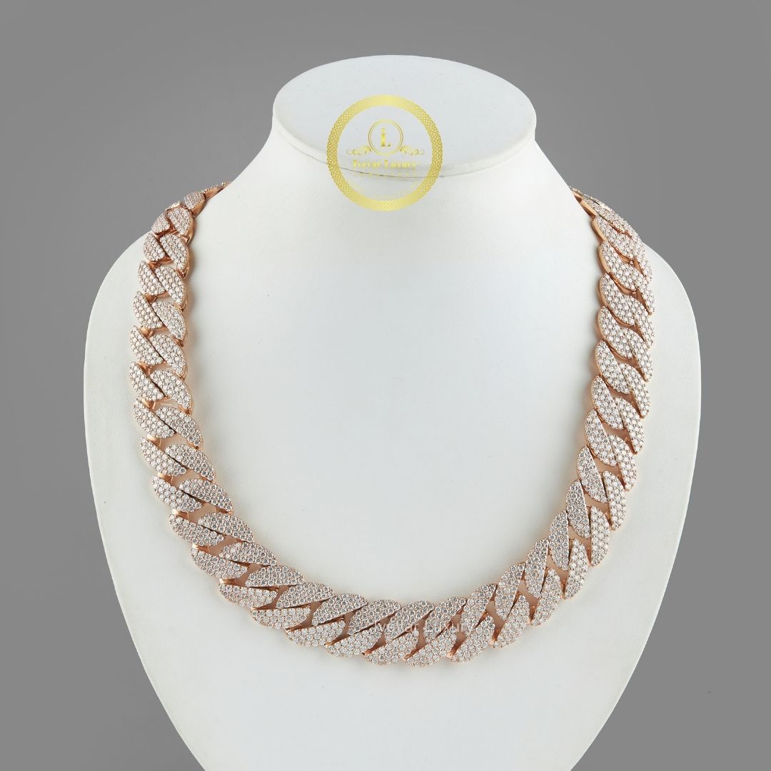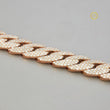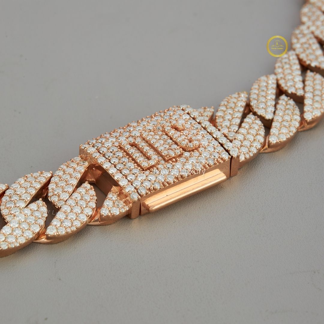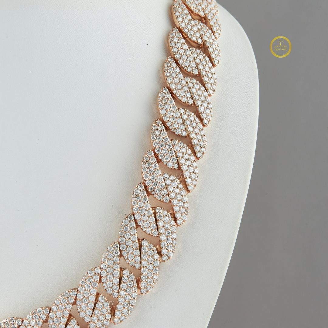 The chain exhibits a thick, substantial design in a popular rose gold finish, giving it a warm, luxurious aesthetic. Each link is meticulously set with brilliant lab-grown diamonds, creating an intense, continuous sparkle often referred to as "iced out." This piece is a heavy and bold statement accessory, representing high-end hip-hop and streetwear jewelry. Utilizing lab-grown diamonds ensures excellent clarity and brilliance, offering a sustainable and more accessible alternative to natural diamonds for achieving this stunning, high-carat-weight look.