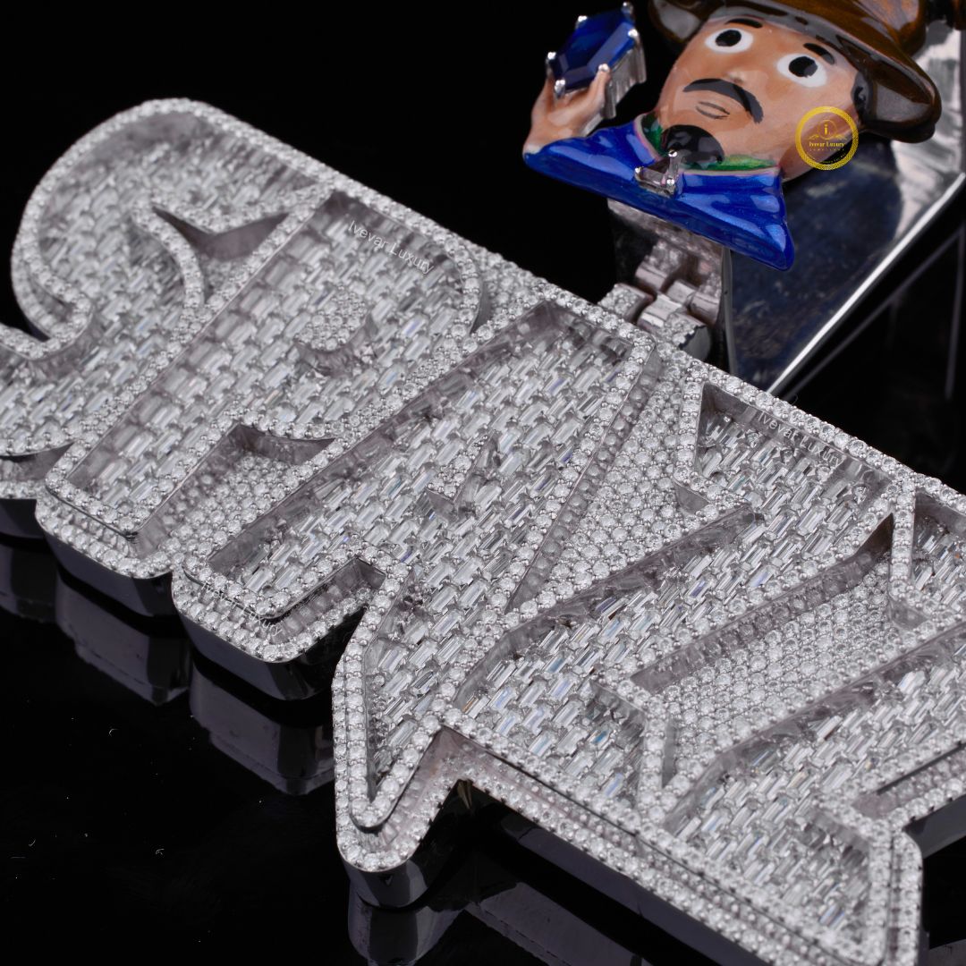 The main element is a bold, straight-line nameplate spelling out a word (possibly "SPAZZ" or similar) in block letters. This plate is entirely paved with round-cut Moissanite diamonds, giving it a full, iced-out surface and a substantial feel. The attached figure is a colorful, three-dimensional wizard wearing a brown hat and blue coat, holding a phone, adding a highly personalized and whimsical touch. The wizard's body serves as the large, fully paved bail for the nameplate, creating a single, incredibly detailed, and unique statement piece.