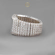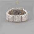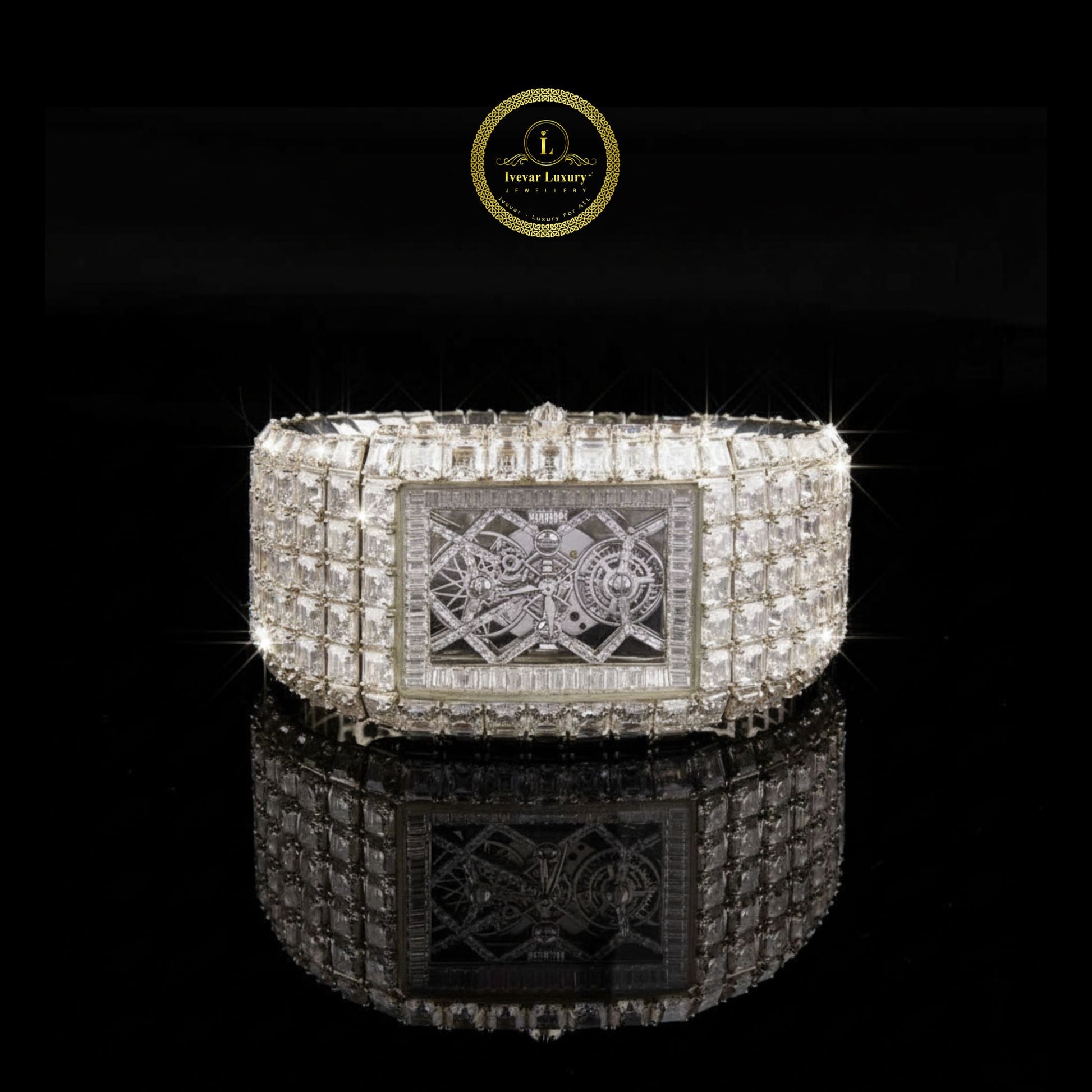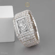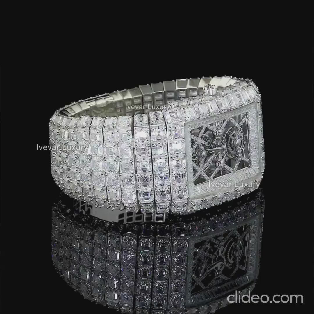 This breathtaking moissanite diamond watch stands as a masterpiece of horological and jewelry craftsmanship. Its entire surface is meticulously adorned with baguette and Asscher -cut diamonds, hand-set to achieve a seamless brilliance that catches every ray of light. The rectangular dial reveals a glimpse of its intricate mechanical movement, showcasing precision and artistry beneath a sea of flawless stones. The bold, mirror-like design reflects pure opulence and confidence, making this timepiece not just a watch but a statement of power and sophistication.