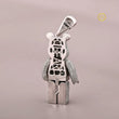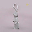 The design is unique for its moving parts, specifically the hips and knees, which allow the legs to swing and dangle, adding dynamic movement to the piece. The figure's surface is smooth and uniform, maximizing the sparkle from the hundreds of small, meticulously set diamonds. A diamond-encrusted bail is fixed to the top of the head, ready to be worn with a chain. The piece is a modern luxury take on a collectible toy icon.