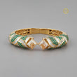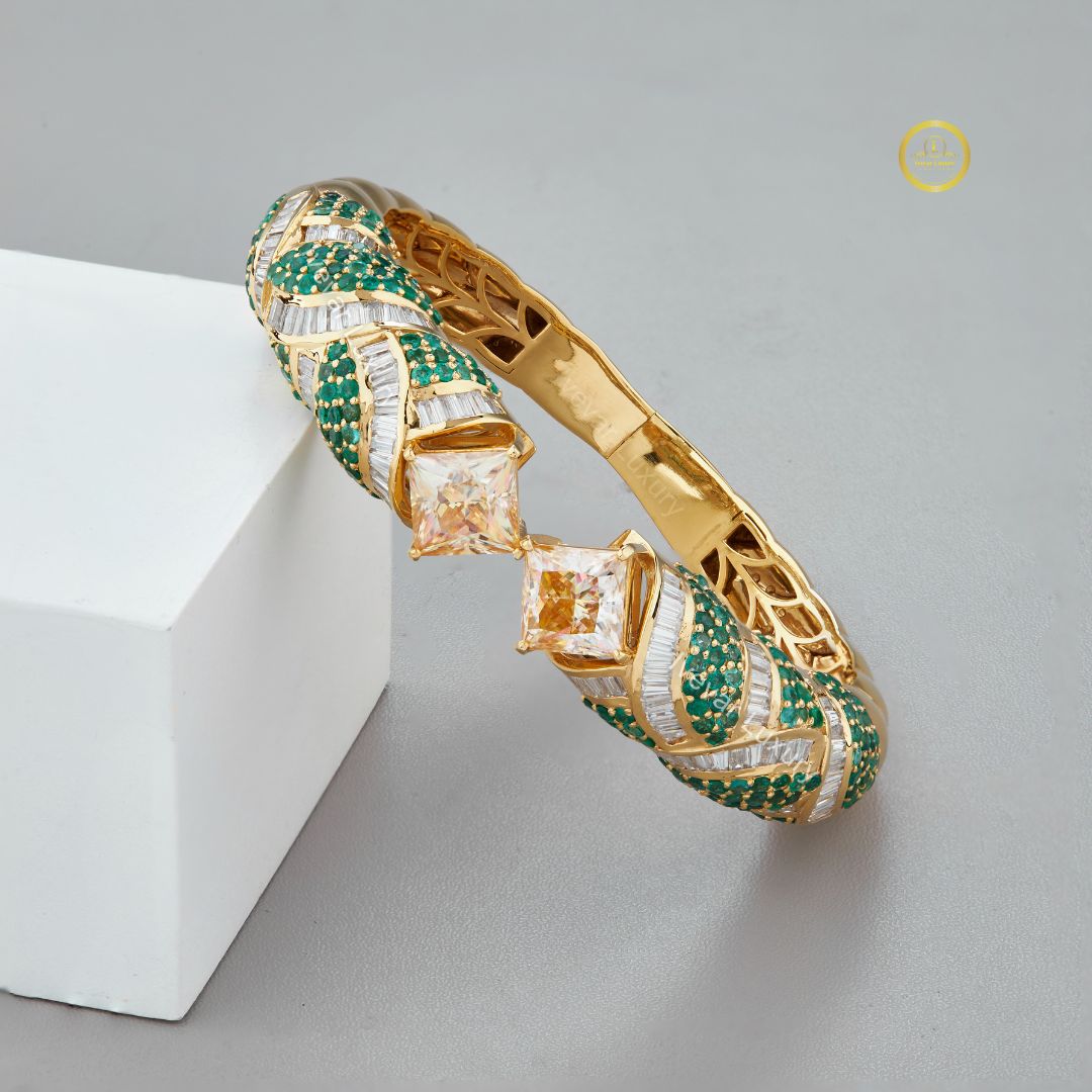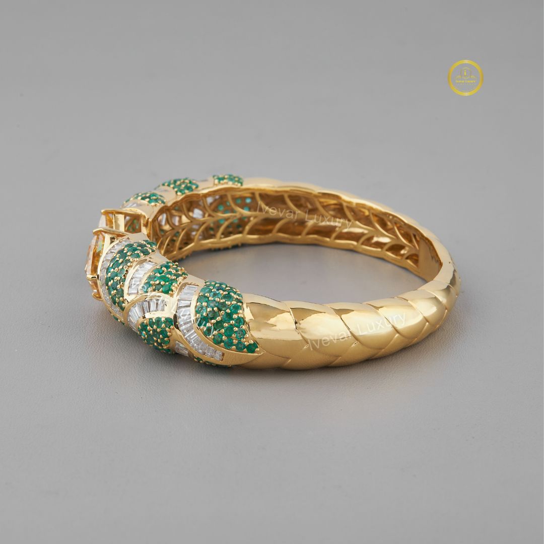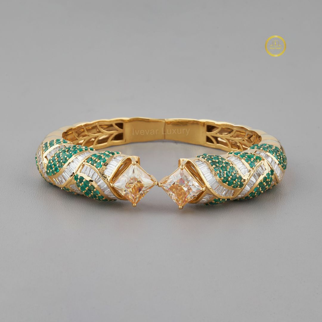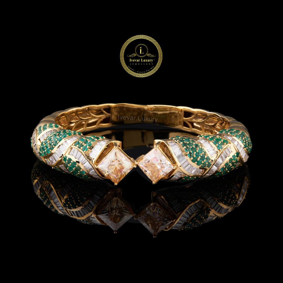 This striking Ivevar Luxury bracelet is an opulent piece featuring a bold design set on a gold-tone base. It is generously embellished with high-quality moissanite diamonds and brilliant green gemstones.