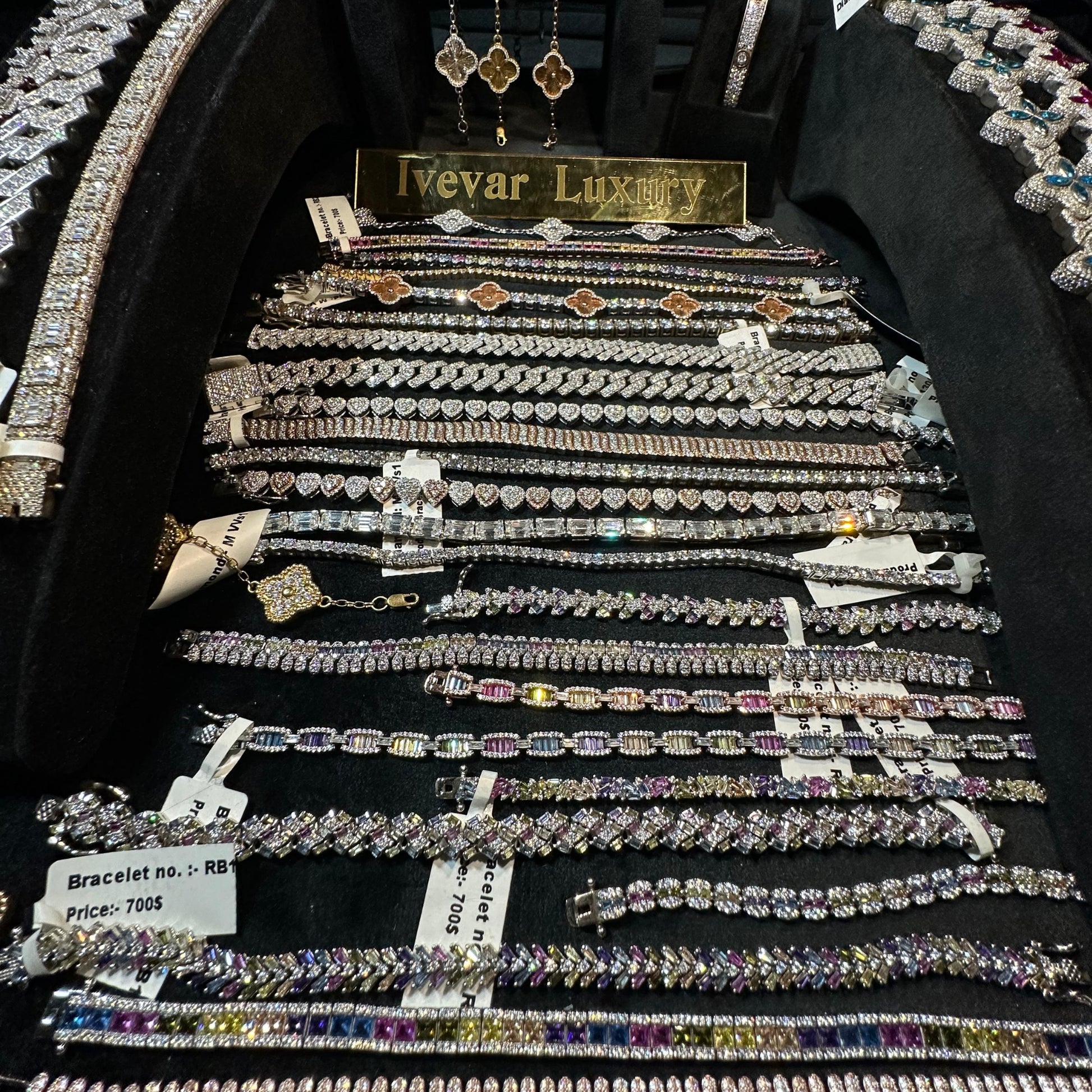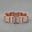 It is heavily encrusted with sparkling moissanite diamonds throughout. The bracelet links are wide and rectangular, prominently featuring rows of baguette-cut moissanite diamonds flanked by borders of smaller round-cut moissanite diamonds. This combination of cuts maximizes the brilliance and creates a rich, textural effect. The bracelet has a bold, statement-making presence, suitable for those who prefer high-end, contemporary, and full-pave jewelry styles.