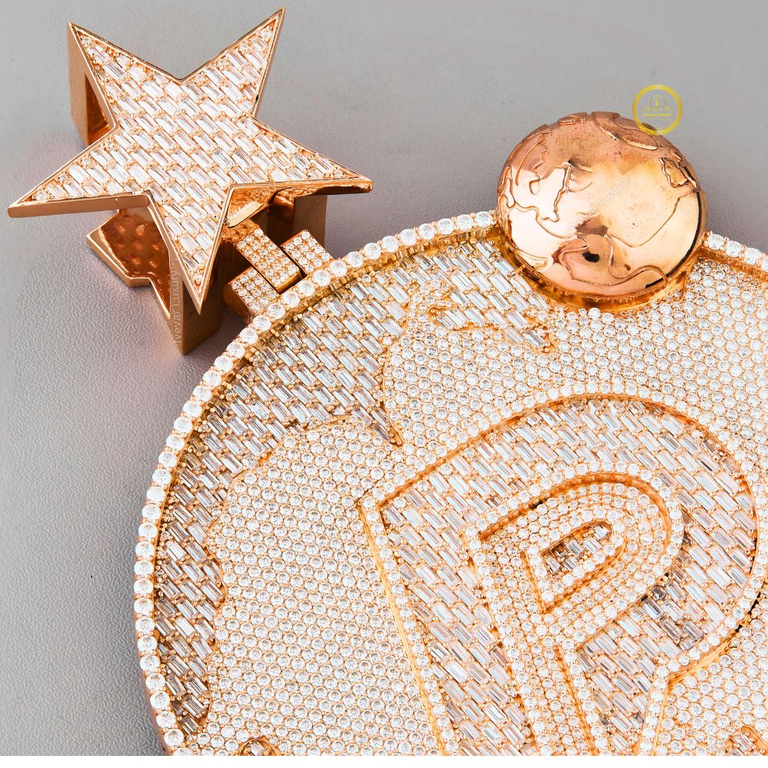 This is a large, highly imaginative, and detailed custom pendant from Ivevar Luxury Jewelers, designed to resemble a planet in orbit, utilizing a warm rose gold metal finish.