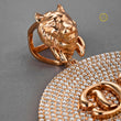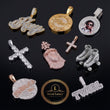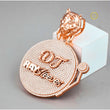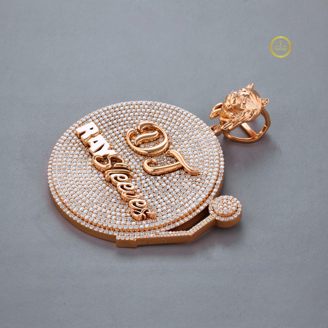 The circular "record" is fully paved with brilliant Moissanite diamonds. It features raised, polished rose gold custom lettering: the initials "DJ" are centered, and the name "RAY Sleeves" is set diagonally across the record, highlighting the wearer's professional identity. It is further customized with a lion head bail and a small, paved, stylized tone arm on the side. This is a bold, high-impact piece that beautifully merges a passion (DJing) with luxurious, personalized jewelry design.