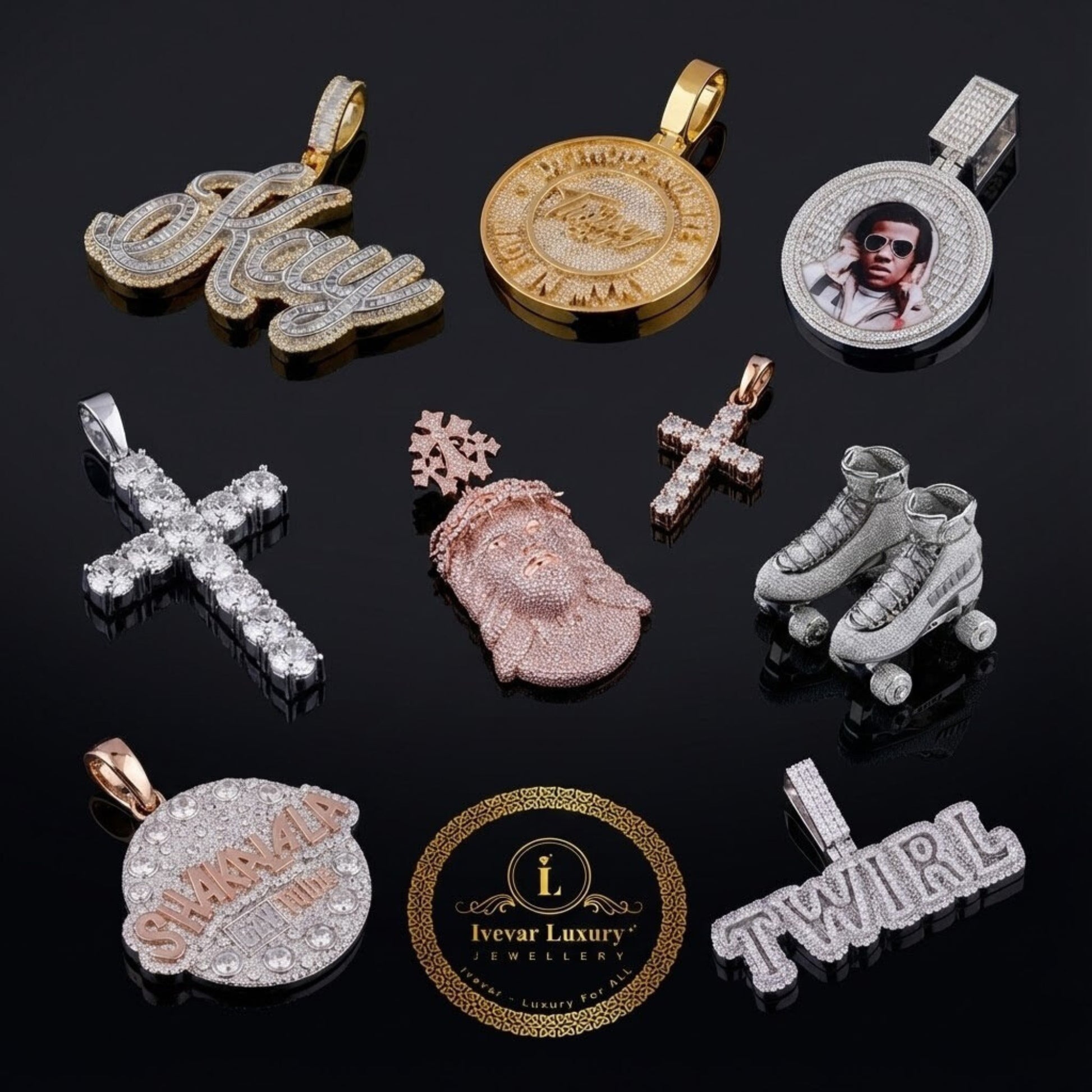 This is an exceptionally detailed and thematic custom pendant designed as a DJ's turntable or record, made by Ivevar Luxury Jewelers, as indicated by the logo. The piece is set in a vibrant rose gold metal.
