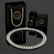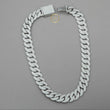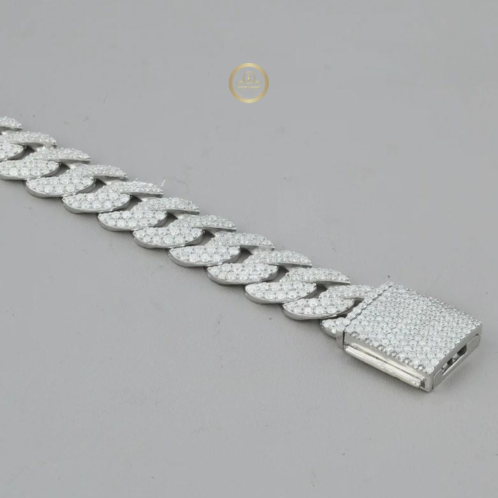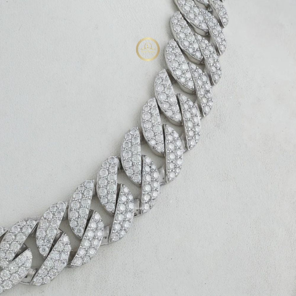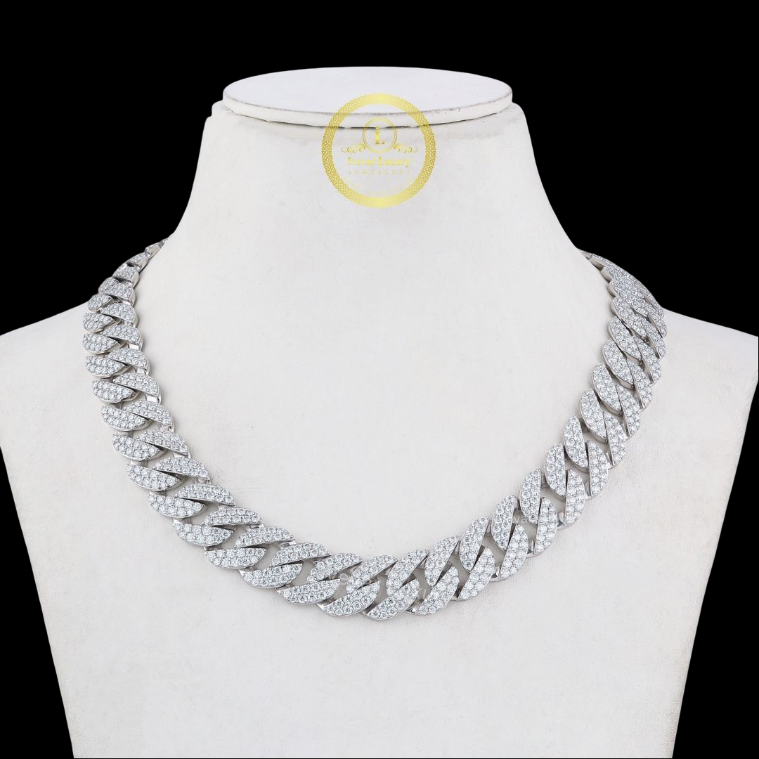 This impressive piece is an "iced-out" Cuban link chain, a bold and heavy necklace style with thick, interlocking links that lie flat . The entire surface is completely paved with numerous, brilliant Moissanite stones .