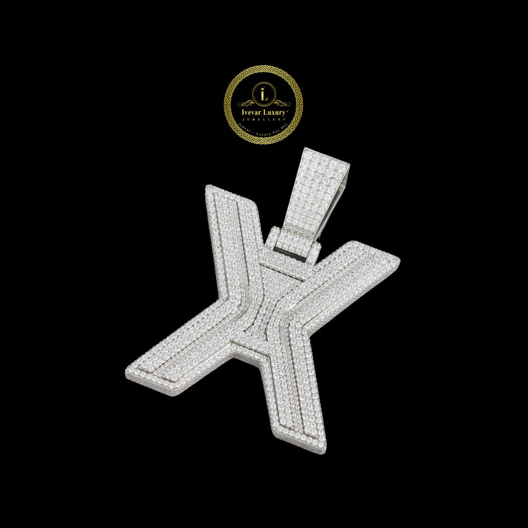 This is a large, heavily paved custom initial pendant featuring the letter 'X' in a bold, block-style font, a typical piece of statement jewelry from Ivevar Luxury Jewelers, as marked by the logo.