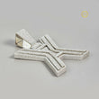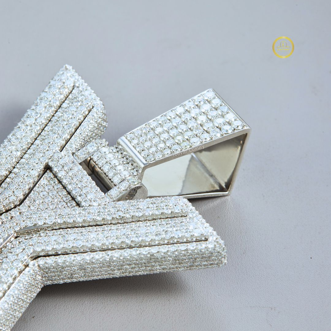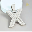 The pendant is crafted in a silver-toned metal and has a striking, layered, three-dimensional design. The body of the 'X' is fully covered in brilliant round-cut Moissanite diamonds, giving it immense sparkle. The design utilizes a beveled or stepped outline around the edges, adding depth and visual interest. The large, rectangular bail (loop) at the top is also fully paved with stones, reinforcing the overall "iced out" aesthetic. This pendant is designed to be a substantial, high-impact piece for personal branding or bold self-expression.
