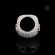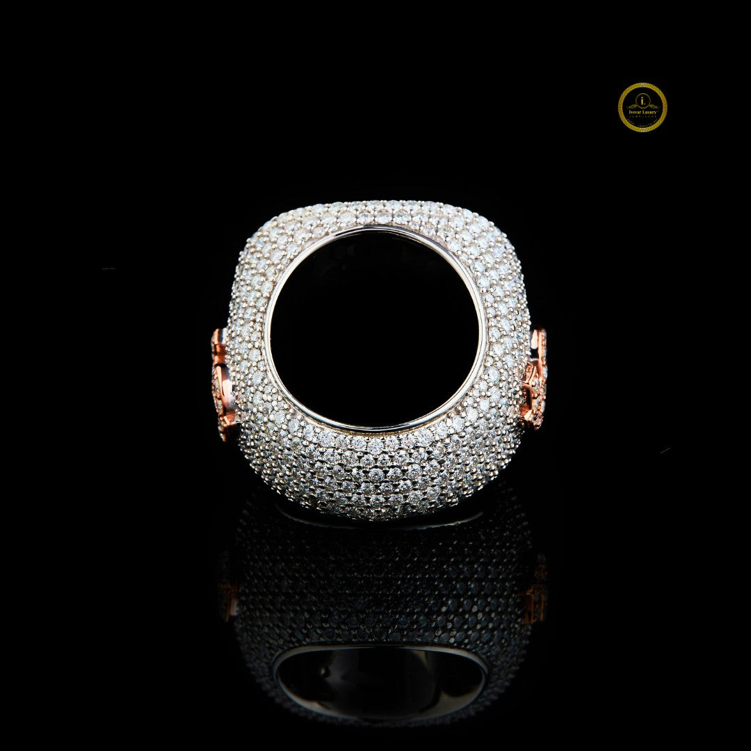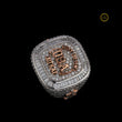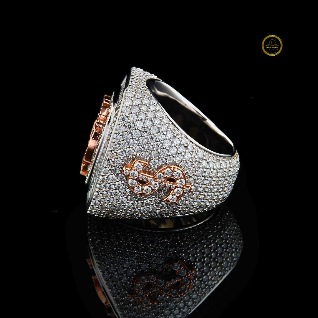 A sophisticated halo of baguette-cut moissanites frames the face, adding structural depth and a distinct rhythmic shimmer. The contrast between the brilliant white stones and the warm rose gold accents creates a high-end, multi-dimensional look. Designed for those who celebrate personal milestones, this piece combines the prestige of a championship ring with the unmatched fire of premium moissanite.