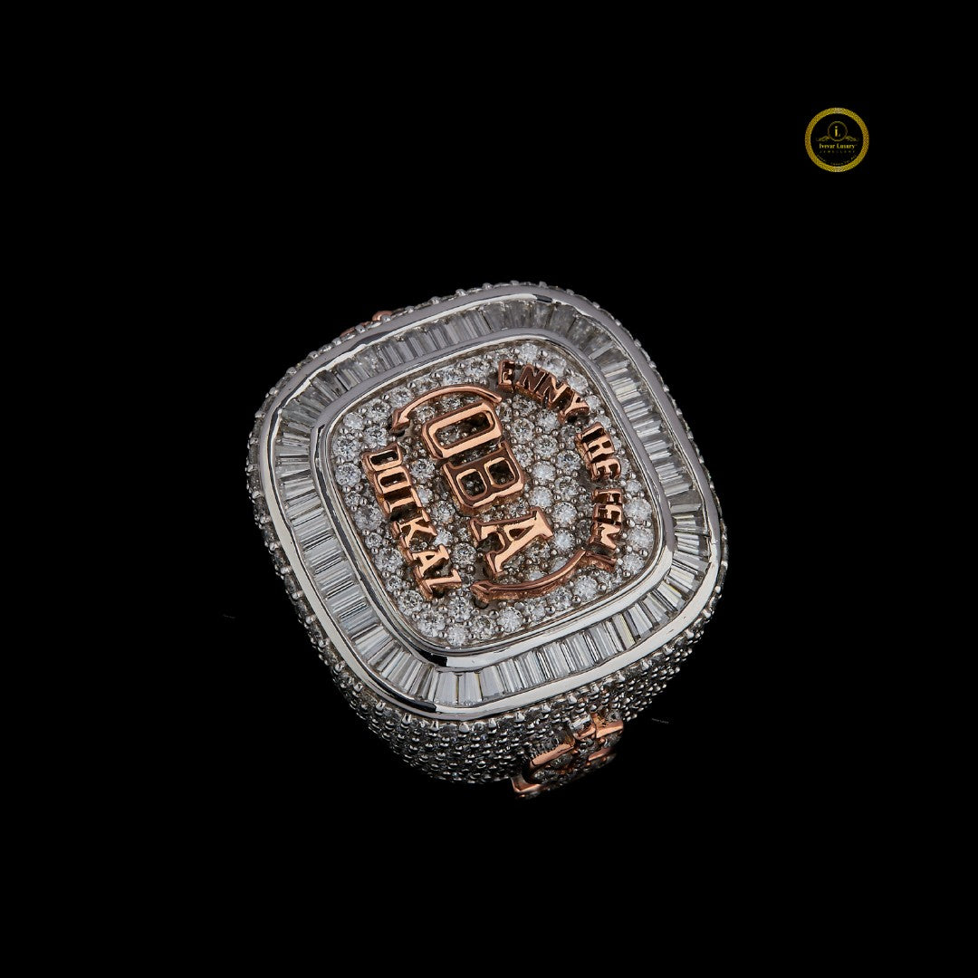 This custom OBA championship-style ring by Ivevar Luxury is a masterclass in personalized jewelry. The center face features rose gold lettering—“OBA,” “ENNY THE FEMT,” and “DOIKAZ”—boldly set against a dense backdrop of round-cut moissanite stones.