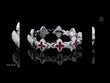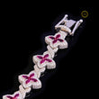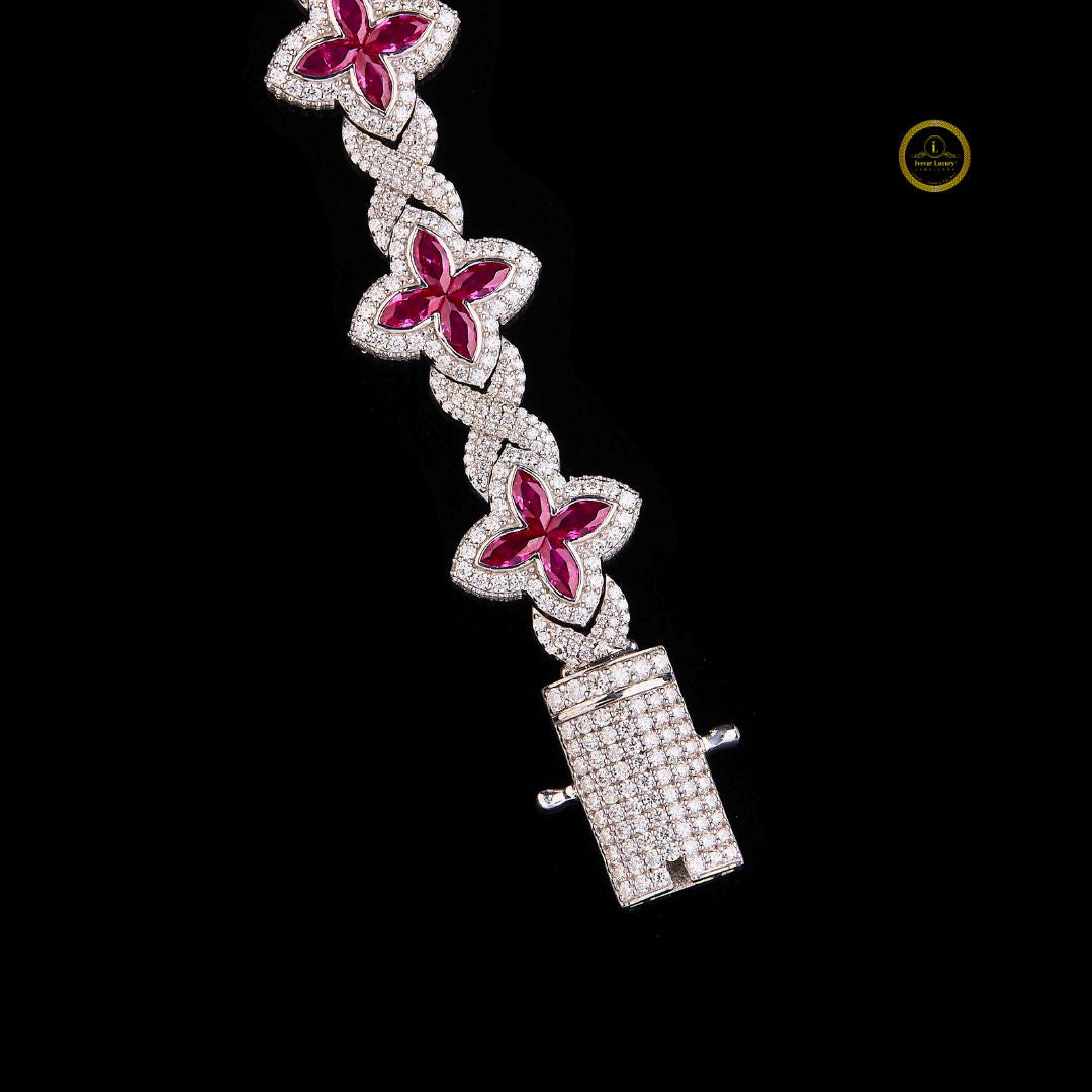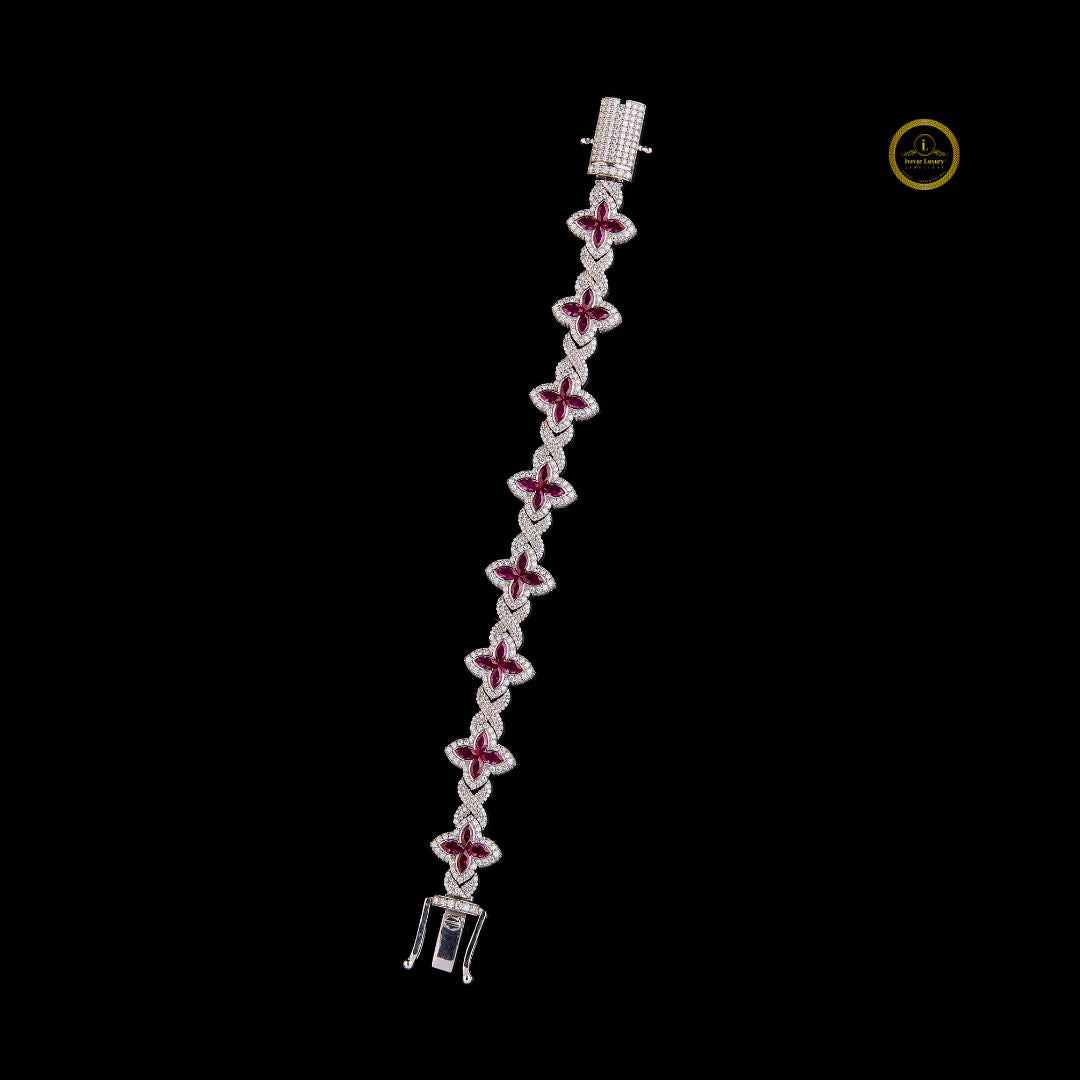 Each clover motif is intricately designed with a central ruby-colored stone surrounded by a brilliant halo of moissanite diamonds. The moissanite stones are known for their exceptional fire and brilliance, offering a high-sparkle, luxurious look. The metal appears to be a rose gold-tone or a yellow/white gold-tone over sterling silver, which complements the red ruby color perfectly. This piece is versatile for both daily wear and special occasions.