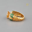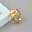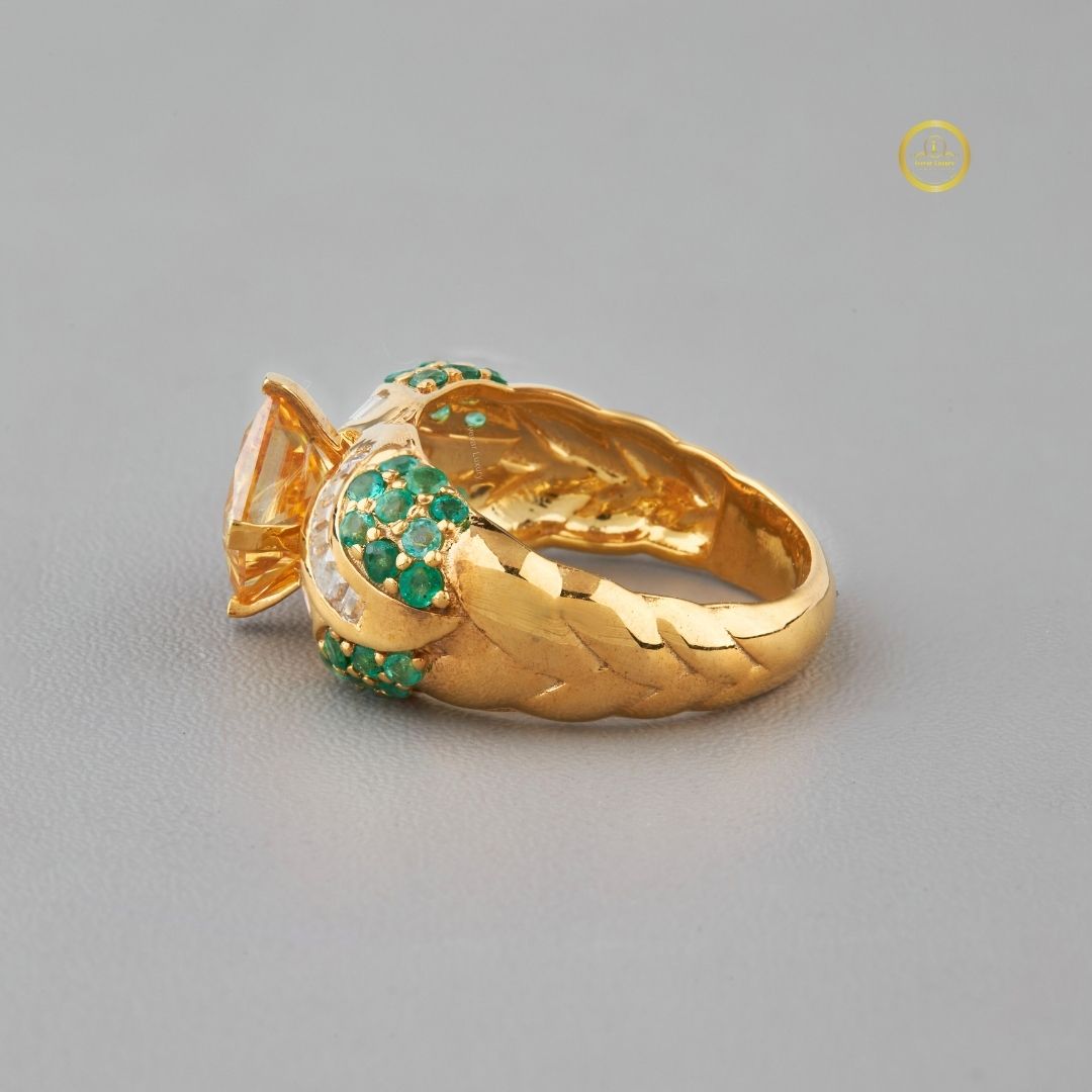 This exquisite ring showcases a breathtaking blend of luxury, color, and craftsmanship. At its center lies a stunning princess-cut yellow gemstone, set in a bold geometric mount that draws the eye instantly. Surrounding the centerpiece, meticulously arranged diamond baguettes add brilliance and structure, enhancing the ring’s regal character.