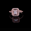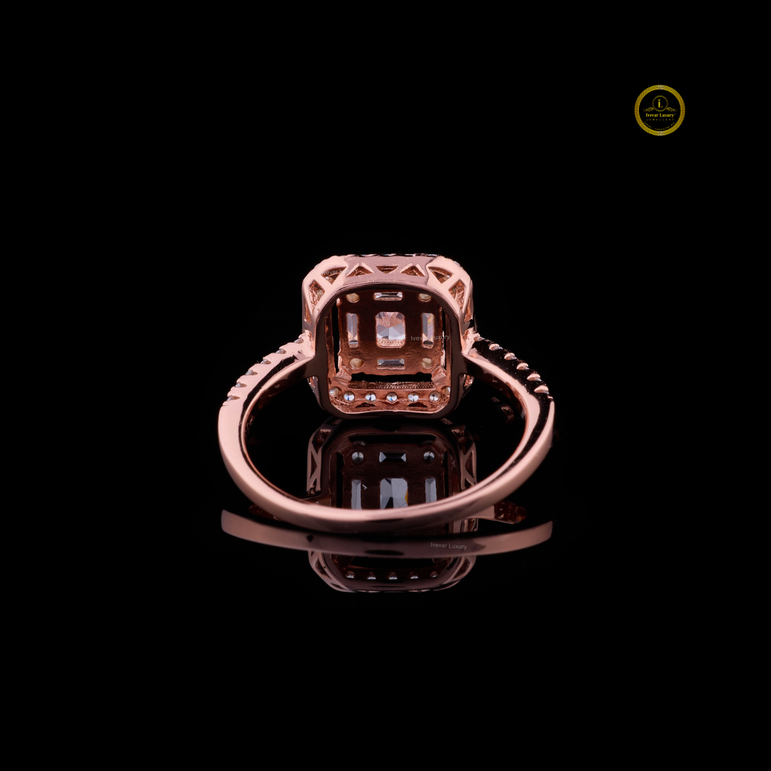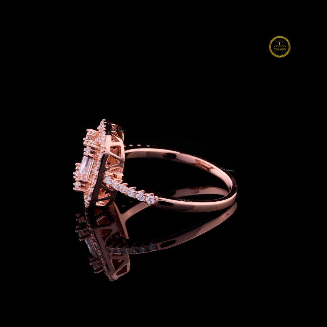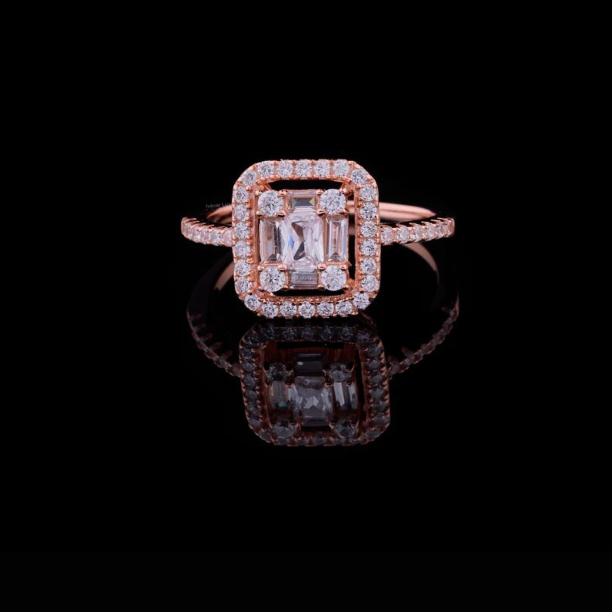 This refined halo ring features an emerald-cut Moissanite diamond framed by a delicate row of round cut pave accents, creating a calm and structured symmetry. The gold setting highlights the center geometry while the baguette side stones add a subtle architectural touch. Designed for everyday comfort and long-lasting brilliance, this piece offers ethical craftsmanship and elegant minimal detail for modern bridal style.