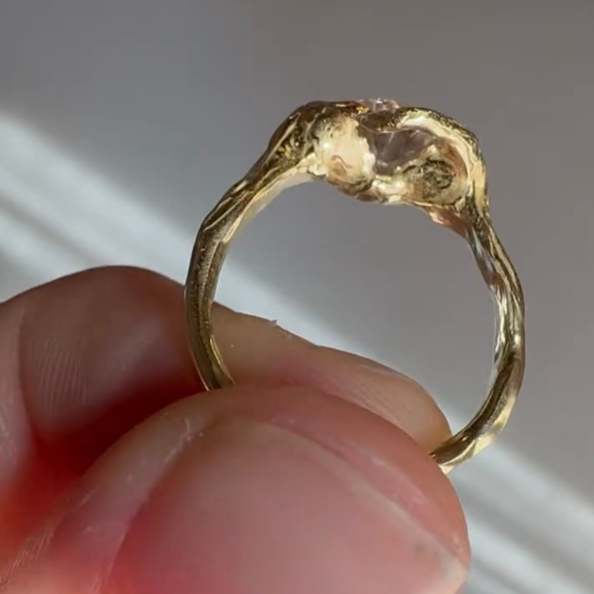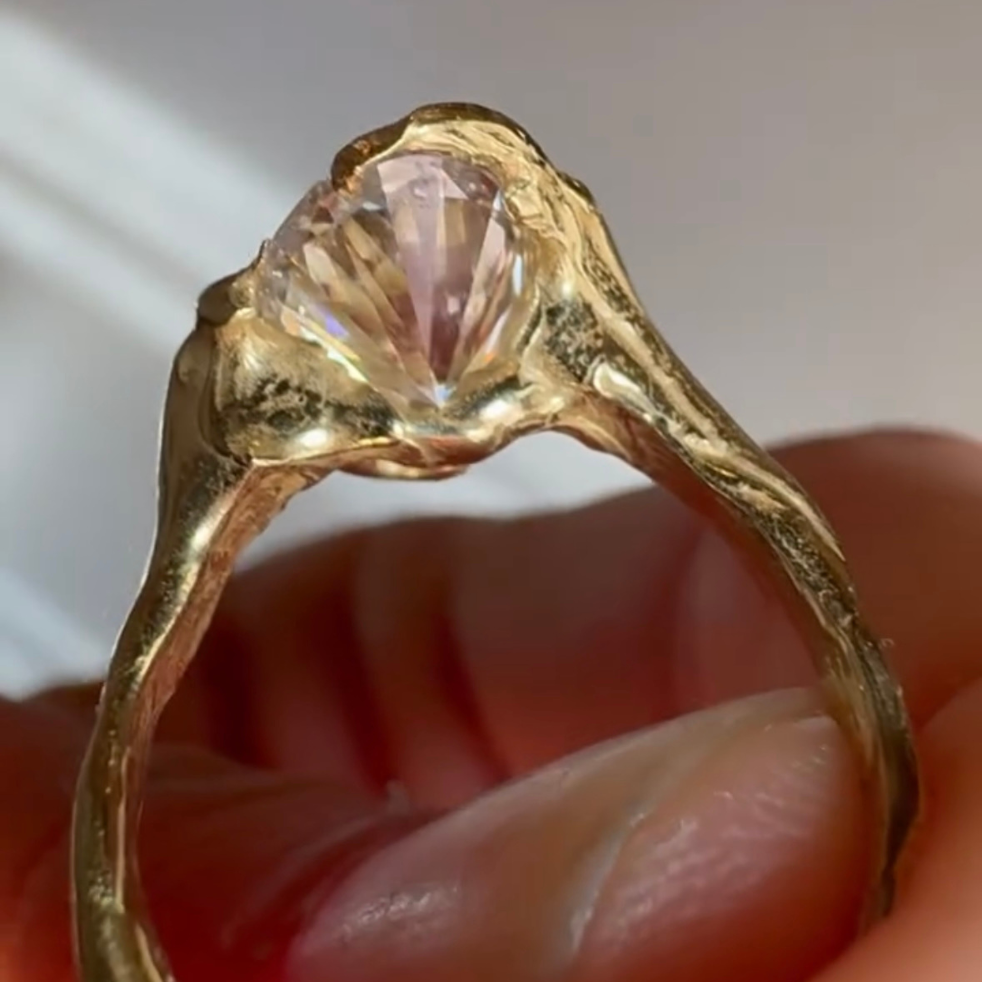At Ivevar Luxury, this exceptional ring is a tribute to organic beauty and handcrafted elegance. Featuring a luminous oval-cut diamond nestled in a sculptural bezel setting, the design flows naturally into a raw-textured gold band, giving the piece a timeless yet modern character. Every curve feels intentional, echoing the beauty of nature while maintaining refined luxury.