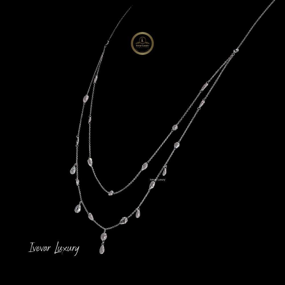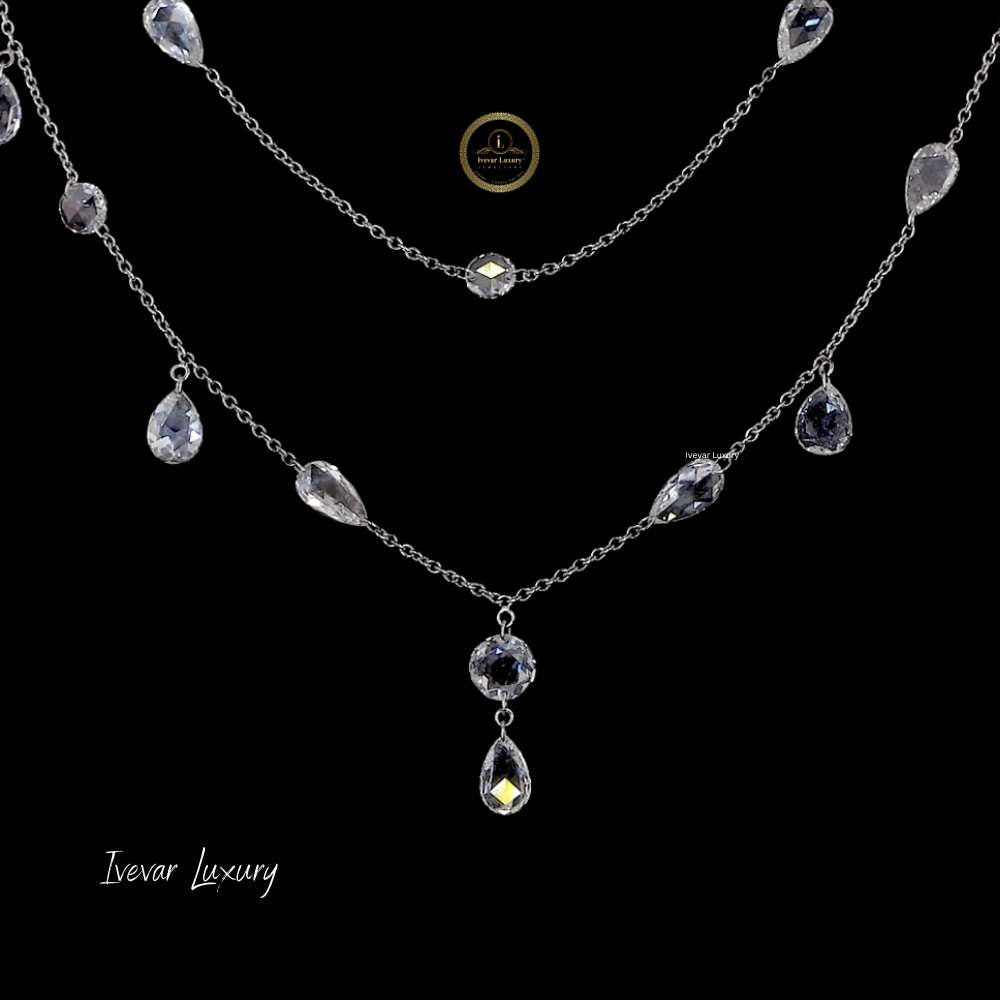 The necklace showcases numerous bezel-set rose-cut natural diamonds strategically spaced along both chains. The chains are of slightly different lengths, creating a graceful drape. The design is further enhanced by subtle drops of pear-shaped rose-cut diamonds along the lower strand, adding movement and extra sparkle. This piece perfectly combines the antique charm of rose-cut diamonds with a chic, contemporary layering aesthetic, making it a beautiful and versatile statement accessory.