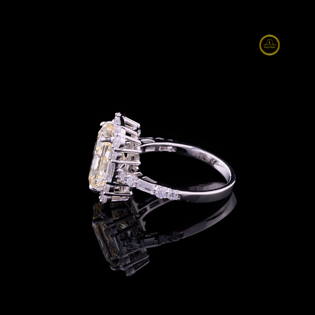 The Imperial Sun Radiant Intense Yellow Diamond Halo Ring captures the brilliance of royalty and the warmth of sunlight. Featuring a magnificent Intense yellow radiant-cut center diamond, this masterpiece is surrounded by a halo of baguette and round-cut diamonds that amplify its dazzling glow. The white gold band adds a touch of modern sophistication, highlighting the gemstone’s vivid color and unmatched fire. A true symbol of prestige, passion, and timeless artistry, this ring is designed for those who embrace luxury in its purest form.