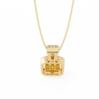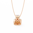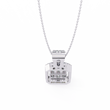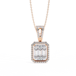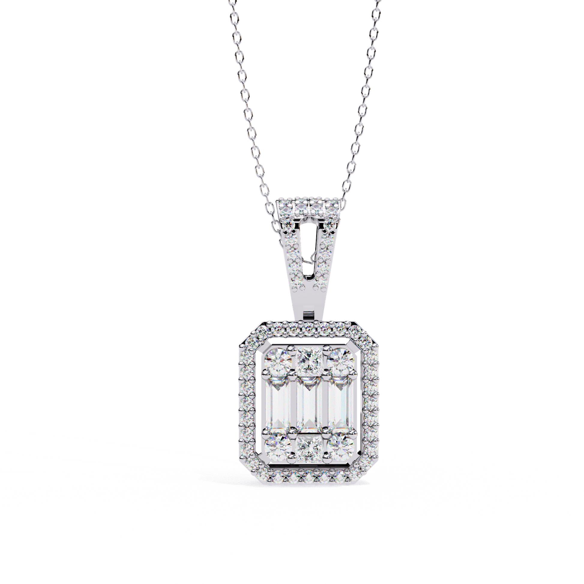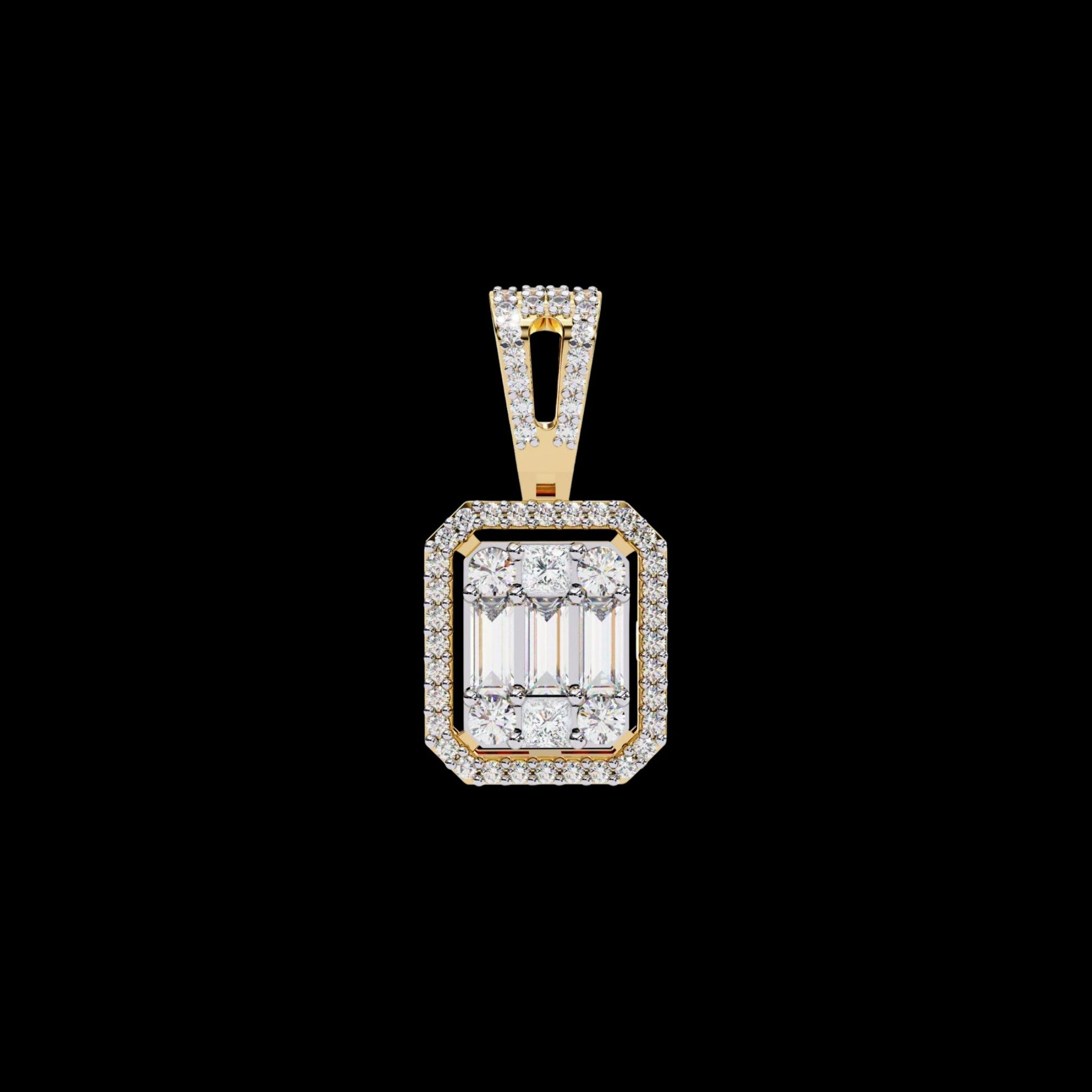 This exquisite pendant exudes timeless sophistication with its rectangular design, featuring a stunning arrangement of Baguette, Princess and Round Cut Diamonds set in gleaming gold. The central row of baguette diamonds is beautifully framed by a sparkling halo of smaller princess and round diamonds, creating a captivating interplay of light and brilliance by Ivevar. The pendant’s geometric elegance is complemented by a diamond-encrusted bail, adding an extra touch of luxury.