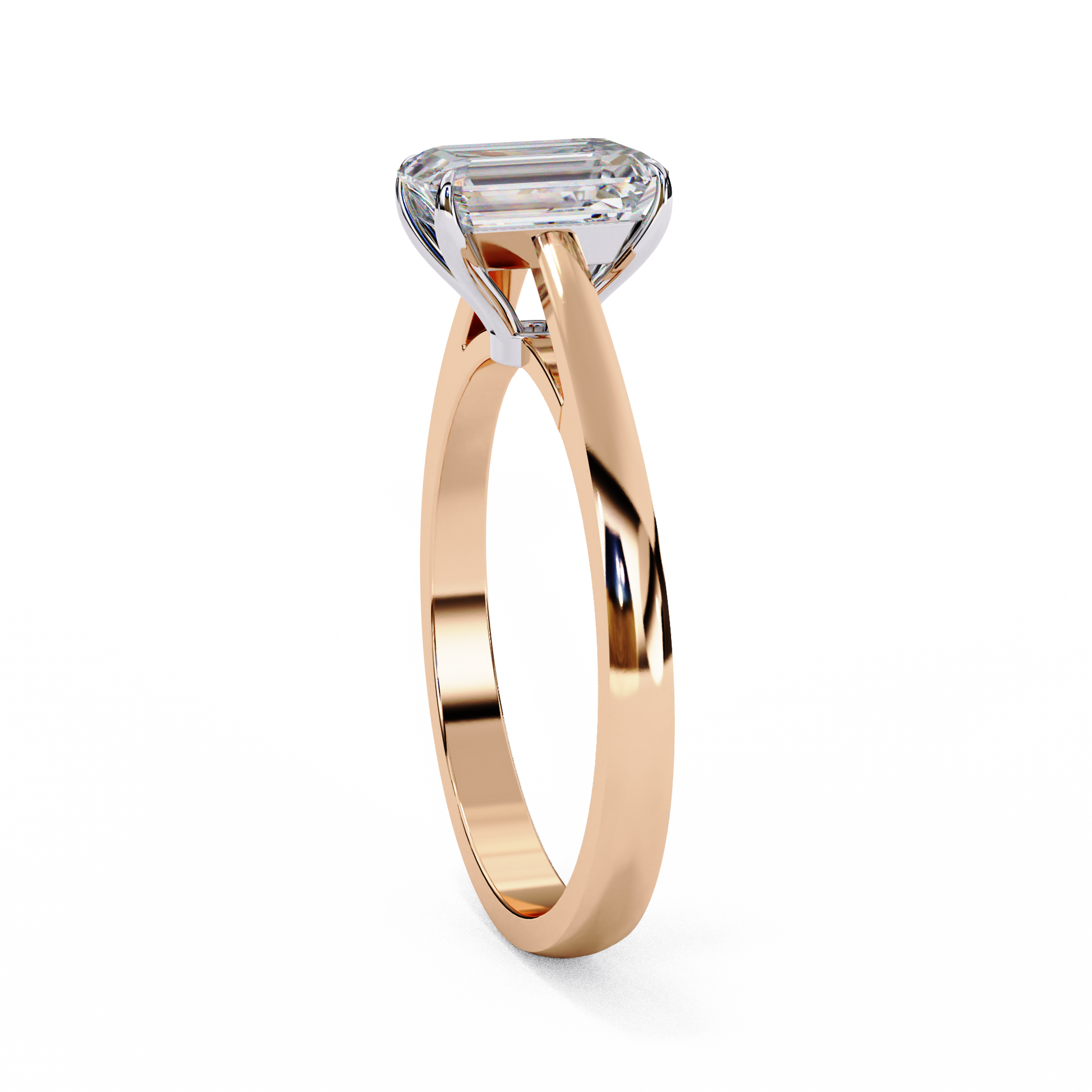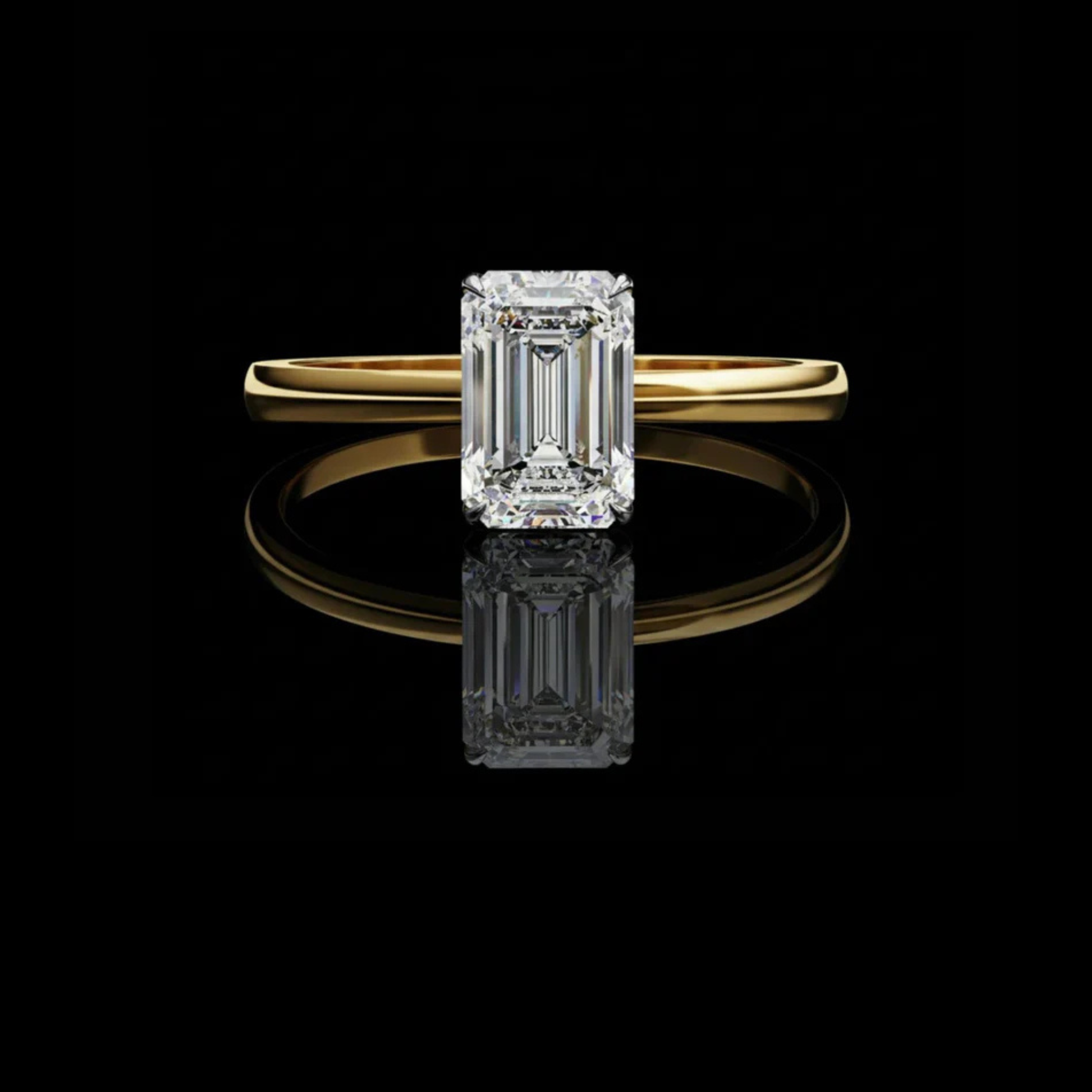 This exquisite ring features a striking emerald-cut diamond known for its elegant lines and mesmerizing depth. Set in a sleek four-prong mount, the diamond is beautifully complemented by a polished gold band, creating a sophisticated and modern look. Perfect for someone who values refined simplicity, clean geometry, and understated luxury.