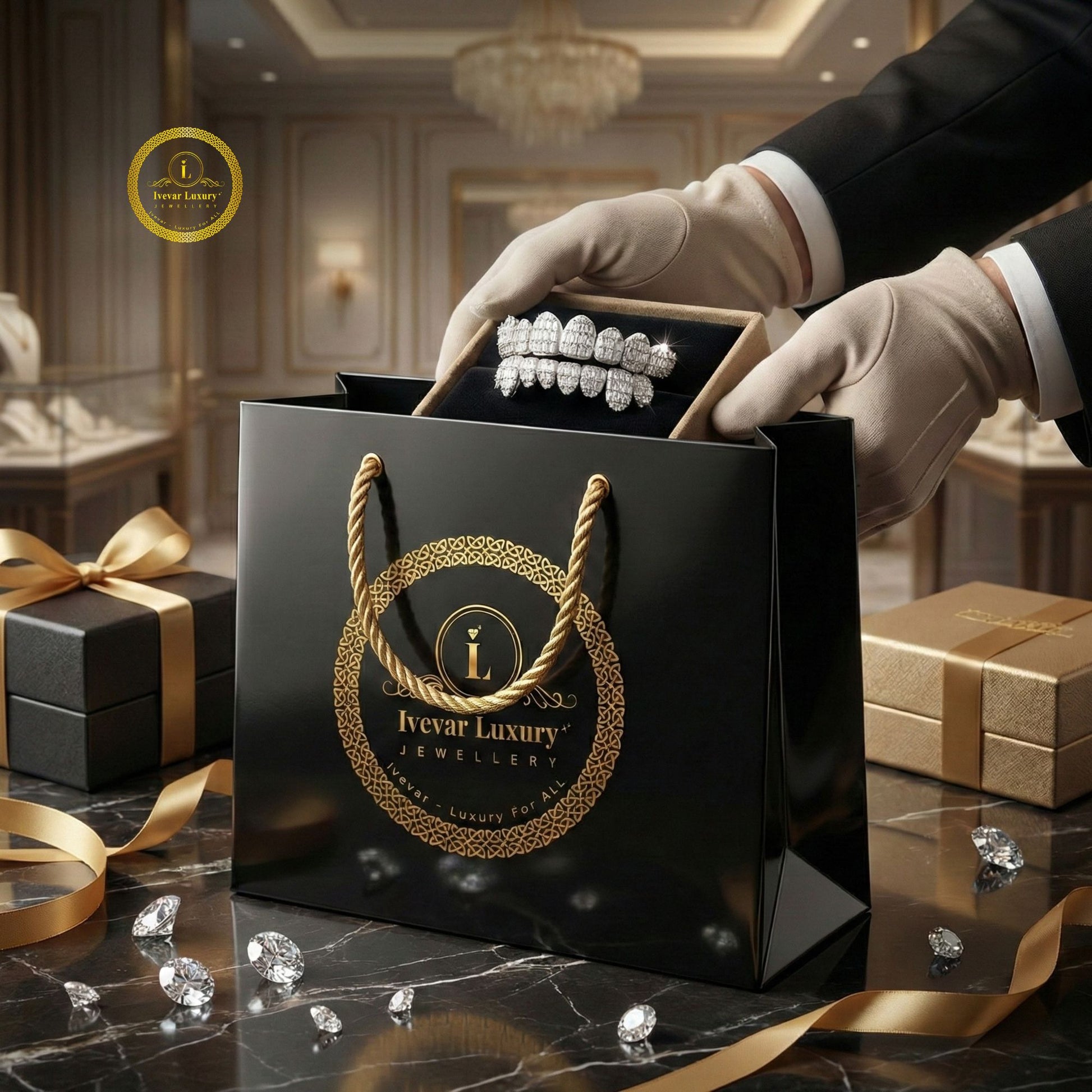 These are high-end, bespoke dental accessories designed to cover the teeth, made from an undisclosed precious metal (likely white gold or silver) and heavily encrusted with Moissanite stones. Moissanite is a popular diamond alternative known for its exceptional brilliance, fire, and durability, offering a luxurious look at a lower cost than natural diamonds.