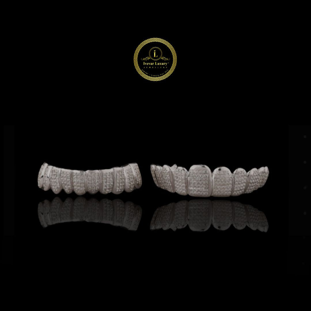 The set appears to include two separate pieces: a smaller one for the top front teeth and a larger one for the bottom front teeth. Both feature a complex, pave-style setting, ensuring maximum sparkle. These grillz are highly customized to fit the wearer's dental structure, serving as a bold fashion statement piece of luxury jewelry.