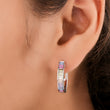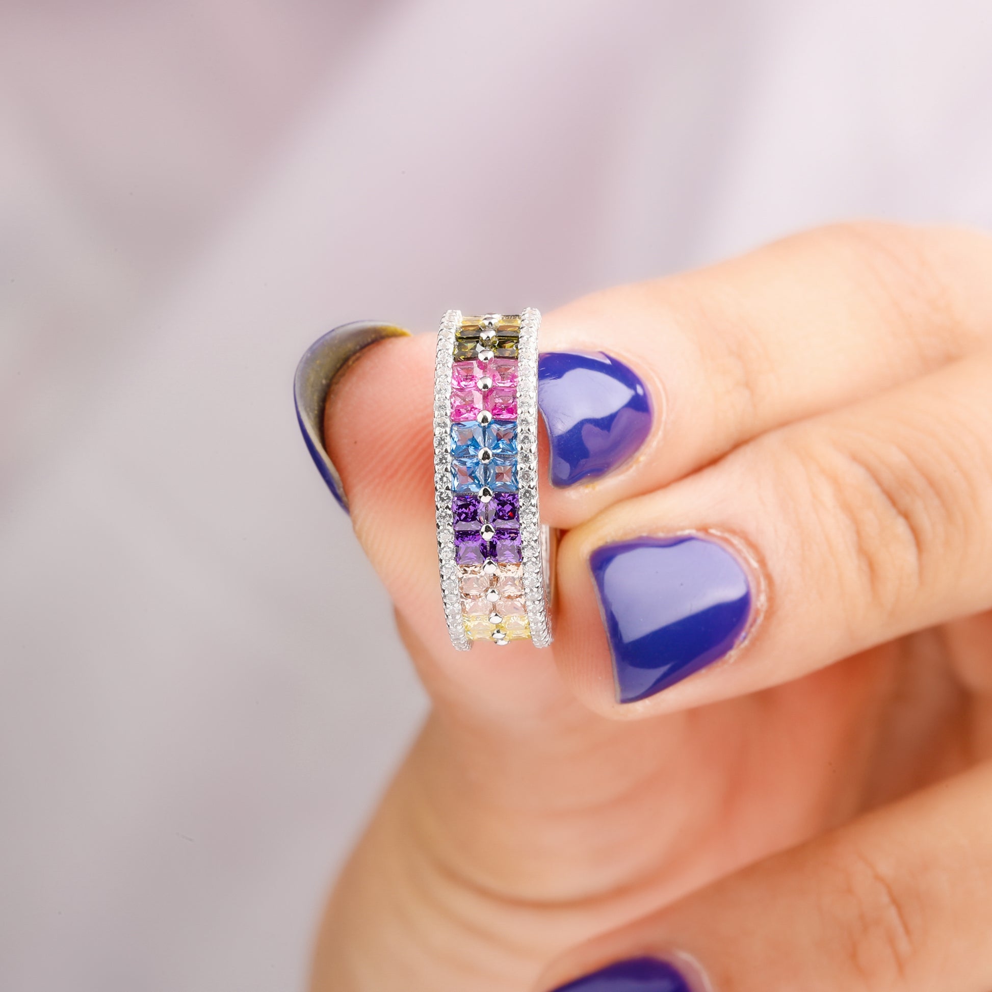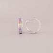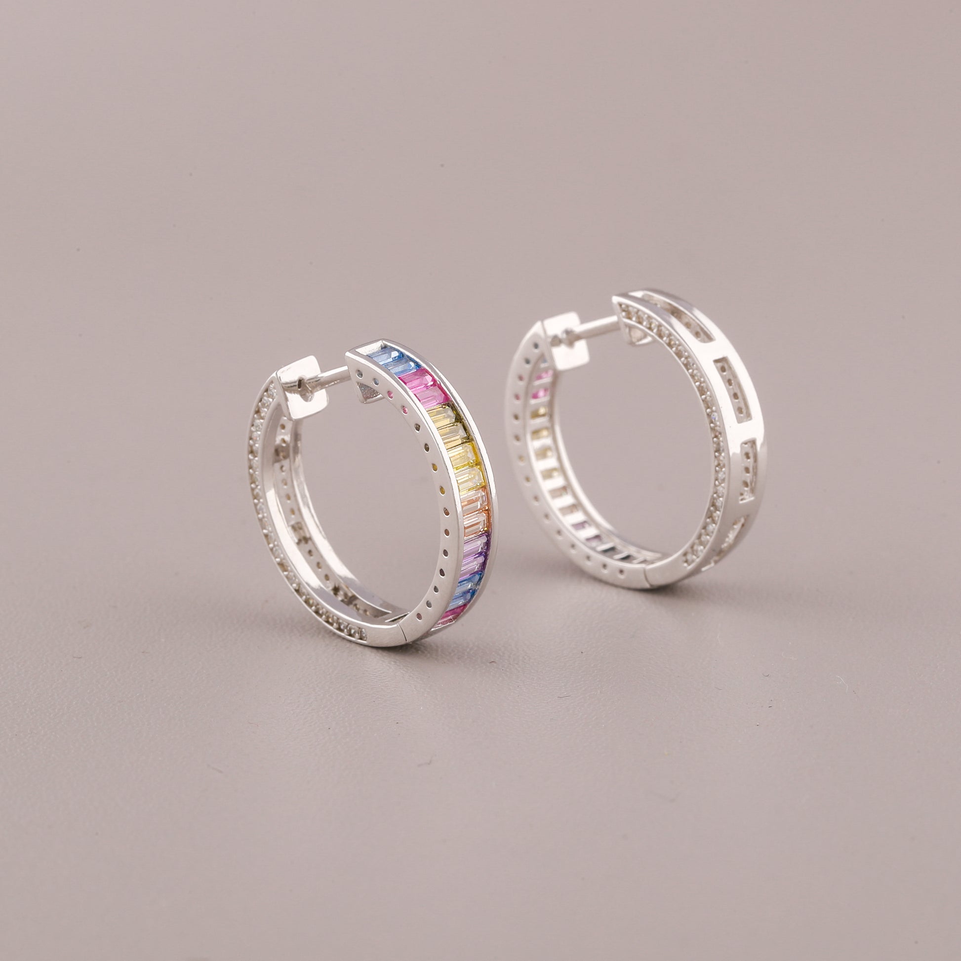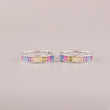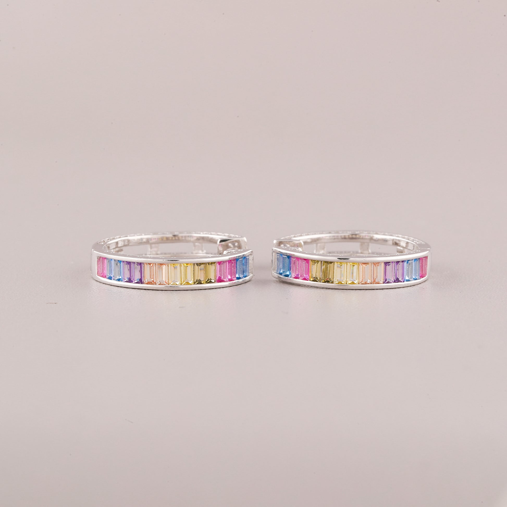 This image showcases a striking pair of Rainbow Diamond Huggie Hoop Earrings, likely crafted from sterling silver or white gold. One earring features a vibrant array of baguette-cut stones in a sequence that mimics the natural rainbow spectrum (red, orange, yellow, green, blue, purple/pink). The colorful stones are channel-set along the front outer edge of the hoop, creating a bold, eye-catching look. The second earring appears to be set with clear, brilliant-cut stones (likely white diamonds or cubic zirconia) for contrast and classic sparkle. This juxtaposition of the colorful "rainbow" hoop and the simpler, clear-stone hoop offers a modern, mismatched styling option, perfect for adding a playful yet luxurious touch to any ensemble.