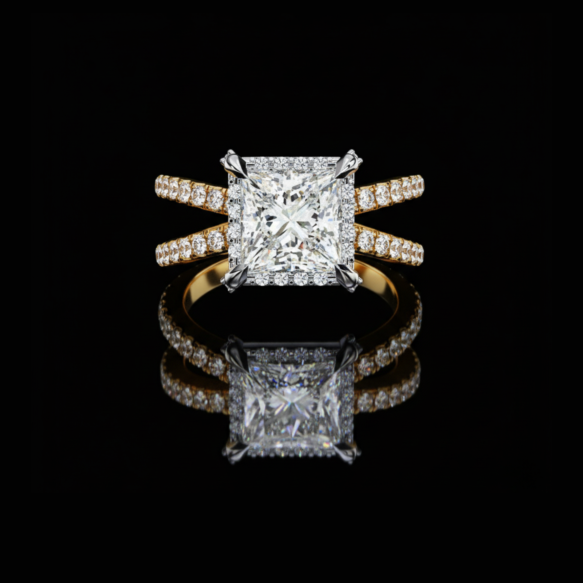 Indulge in pure brilliance with this Princess-Cut Double-Band Halo Diamond Ring by Ivevar Luxury, crafted to elevate every special moment. The bold Princess-cut center stone is surrounded by a radiant halo of micro-pave diamonds, enhancing its fire from every angle. This exceptional design features a dual gold shank lined with sparkling diamonds, offering a luxurious, modern twist on classic elegance. Perfect for engagements, anniversaries, or unforgettable celebrations, this piece showcases the refined artistry and premium craftsmanship for which Ivevar Luxury is known.