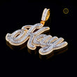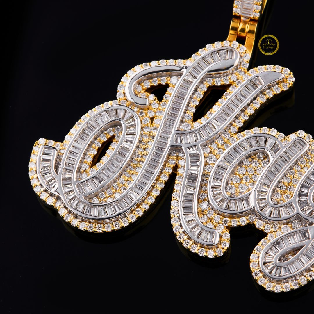 This striking pendant features a two-tone design, combining bright white metal (likely sterling silver or white gold) for the script lettering with rich yellow gold plating on the bail and accents. It is heavily encrusted with moissanite diamonds in both round brilliant cuts (forming the outer halo and edges) and prominent baguette cuts (filling the center of the letters). The mixed cuts maximize the sparkle and give the piece a luxurious, dimensional, and icy appeal. The pendant is a statement piece of custom jewelry, associated with the brand "Ivear Luxury."
