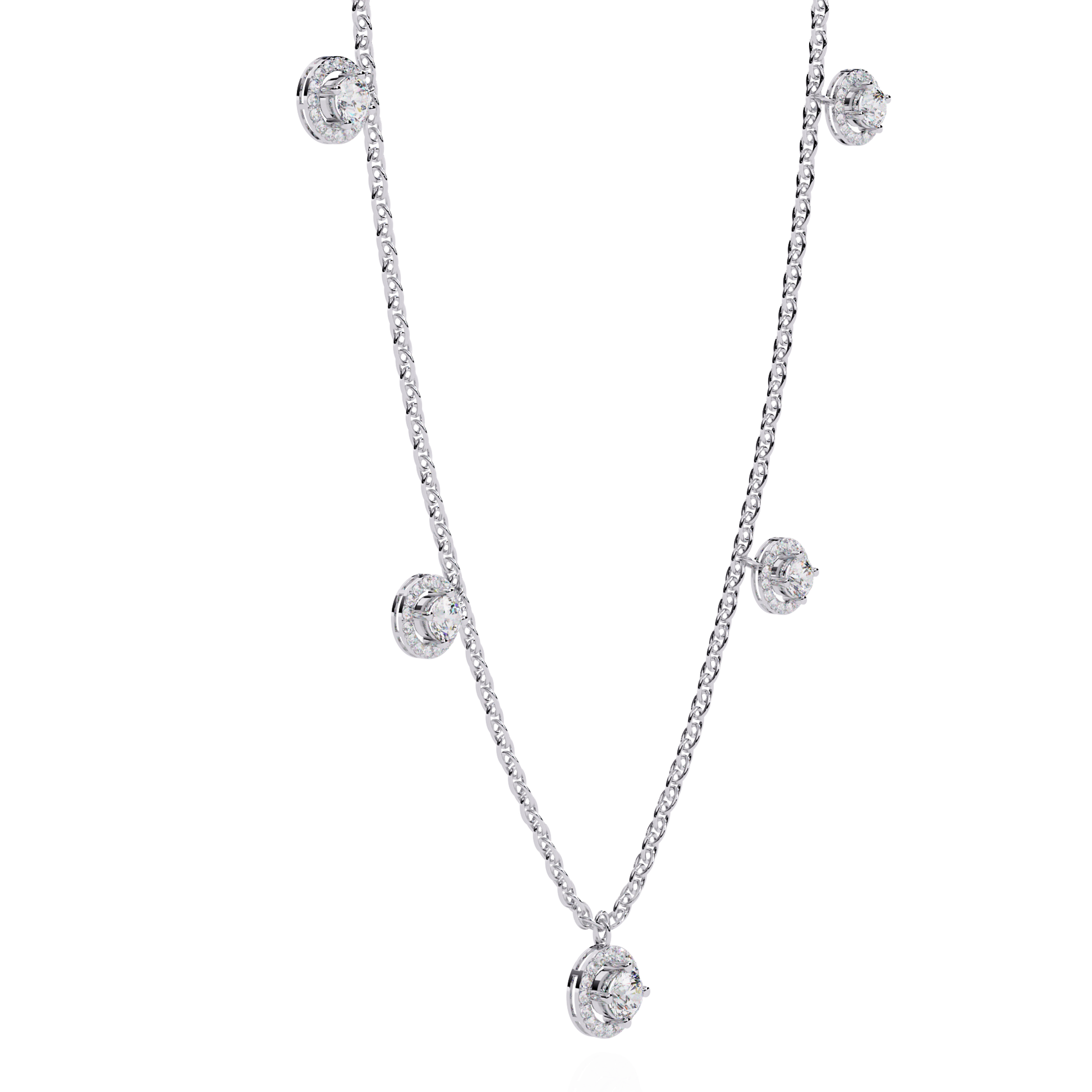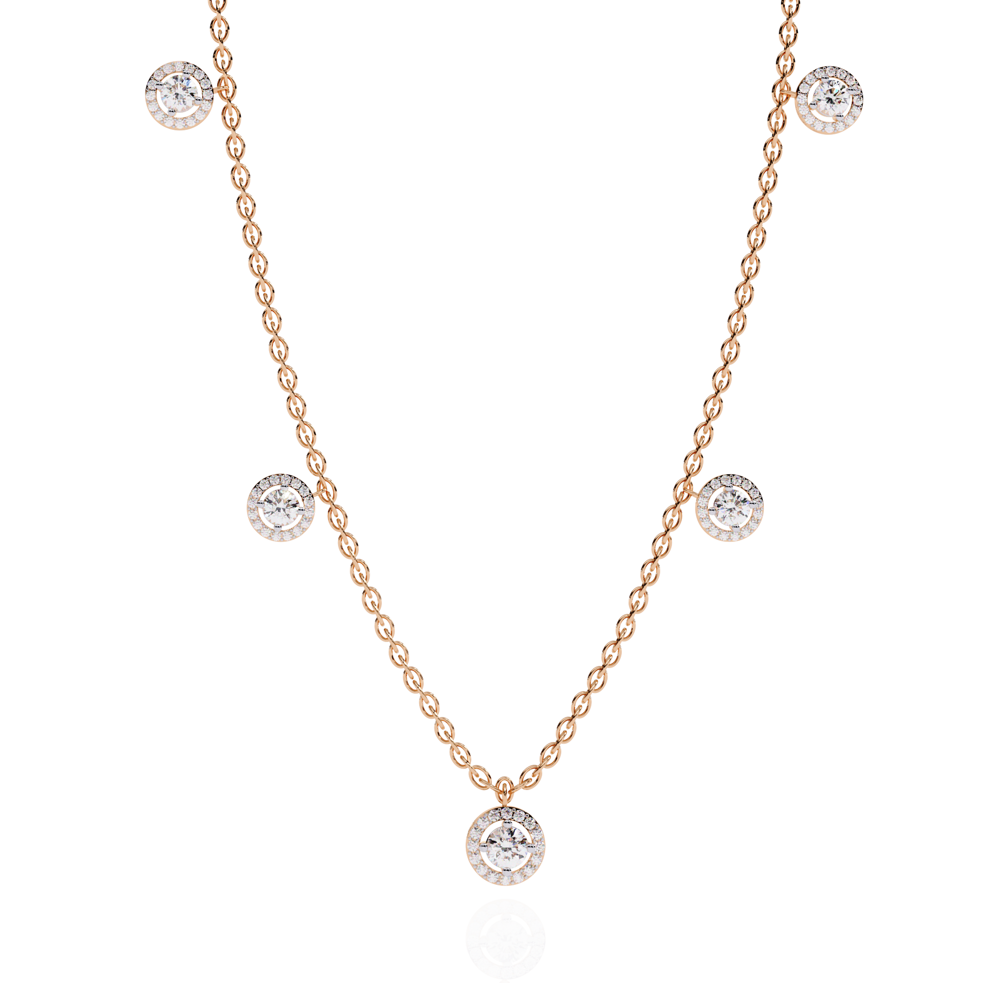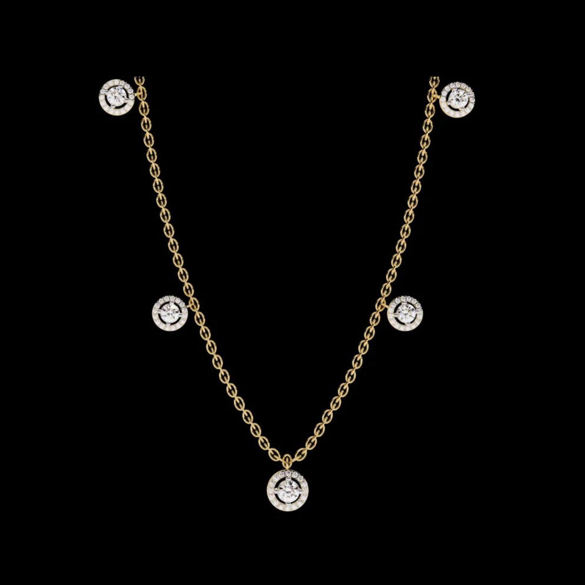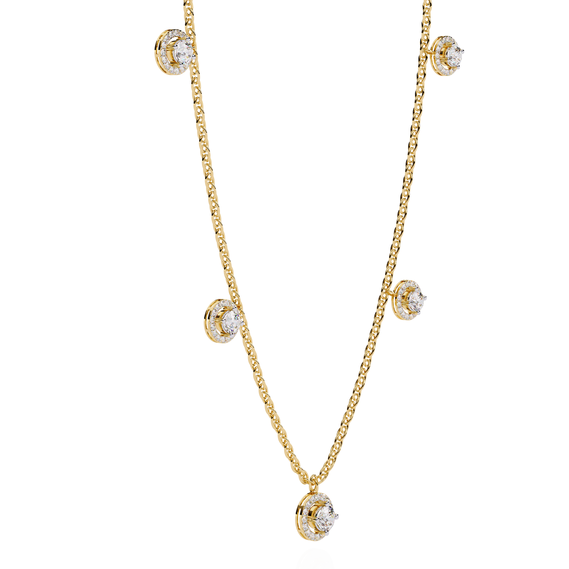 This elegant necklace features a delicate gold chain adorned with evenly spaced Round Cut Diamond pendants, each encircled by a halo of smaller sparkling stones for added brilliance. The symmetrical arrangement of the diamonds creates a refined, balanced aesthetic that exudes timeless luxury. Perfect for both everyday sophistication and special occasions, this piece seamlessly combines classic design with modern elegance, highlighting the craftsmanship and opulence of fine jewelry by Ivevar.