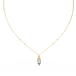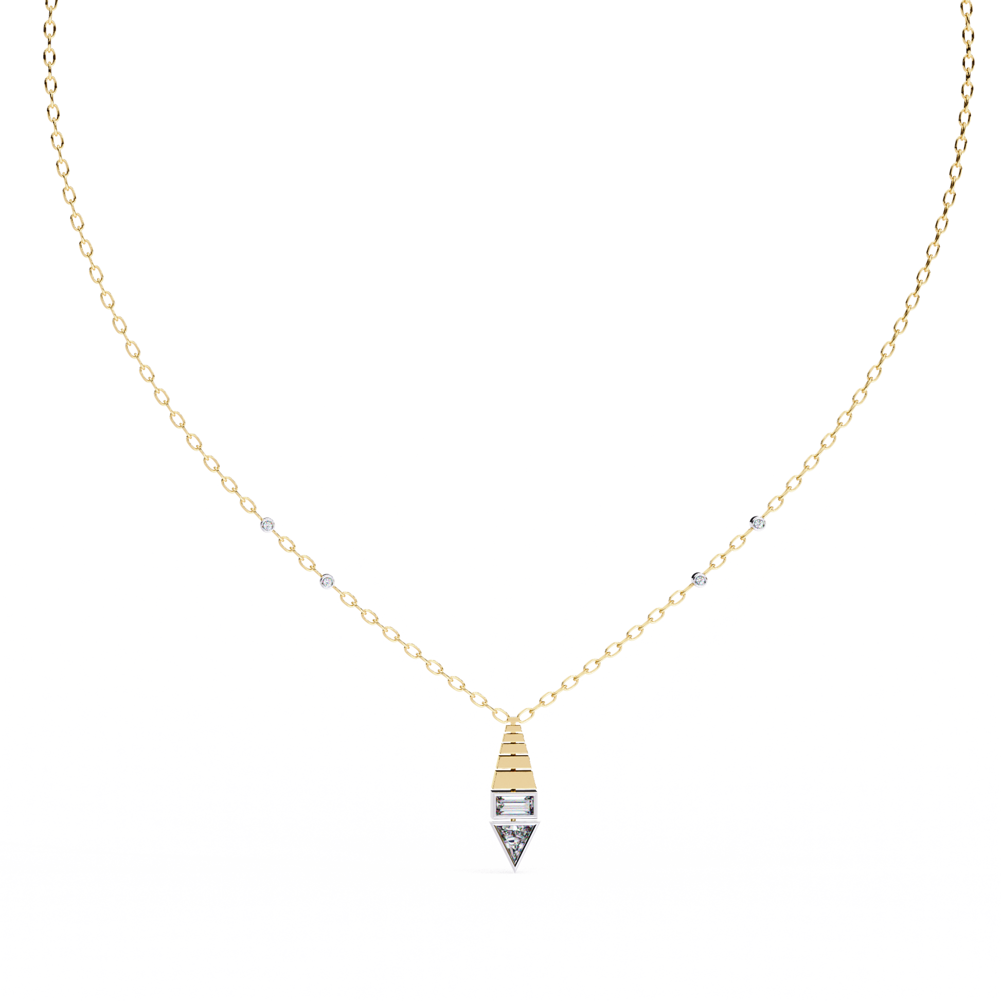This elegant pendant features a striking geometric composition of triangle, baguette, and round diamonds, creating a modern yet timeless look. The diamonds are set within a sleek two-tone drop that combines polished gold with bright white metal accents, enhancing the crisp lines and unique shapes of each stone. Suspended from a delicate gold chain adorned with additional small round diamonds, the design offers a refined balance of sparkle and structure, making it a sophisticated statement piece for any jewelry collection.