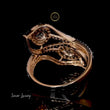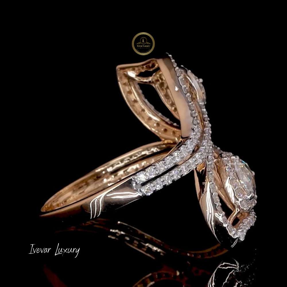 The centerpiece of the design is two prominent, dazzling pear-shaped rose-cut natural diamonds, each set within an eye-catching, curving frame. The entire structure is lavishly accented with multiple rows of smaller, pave-set brilliant diamonds, enhancing the brilliance and creating a voluminous, fiery effect. The overall look is modern yet romantic, blending high luxury with an architectural, free-flowing form. This ring is perfect for grand occasions and truly captures attention.