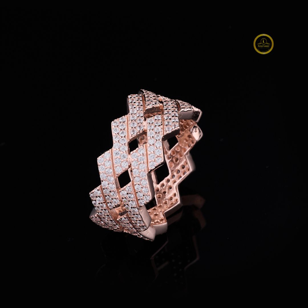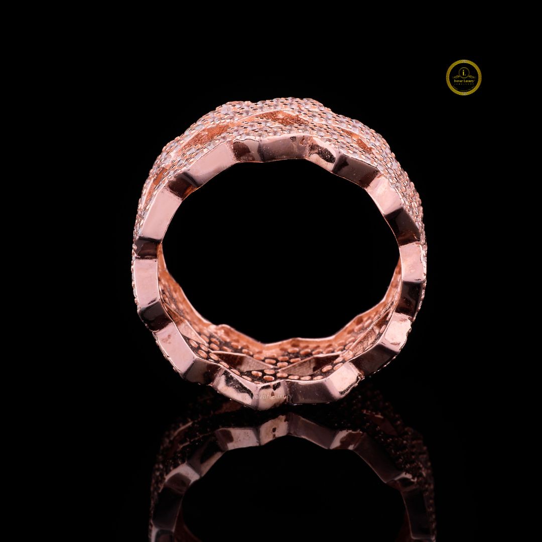 This exquisite ring showcases a unique woven design crafted in stunning rose gold, creating a bold yet sophisticated look. Each strand is adorned with sparkling pavé crystals, adding a brilliant touch of glamour and making the piece truly stand out. Its intricate craftsmanship and luxurious finish make it a perfect statement ring for parties, formal events, or everyday elegance. A beautiful blend of style, shine, and modern sophistication, this ring is an ideal addition to any jewelry collection.