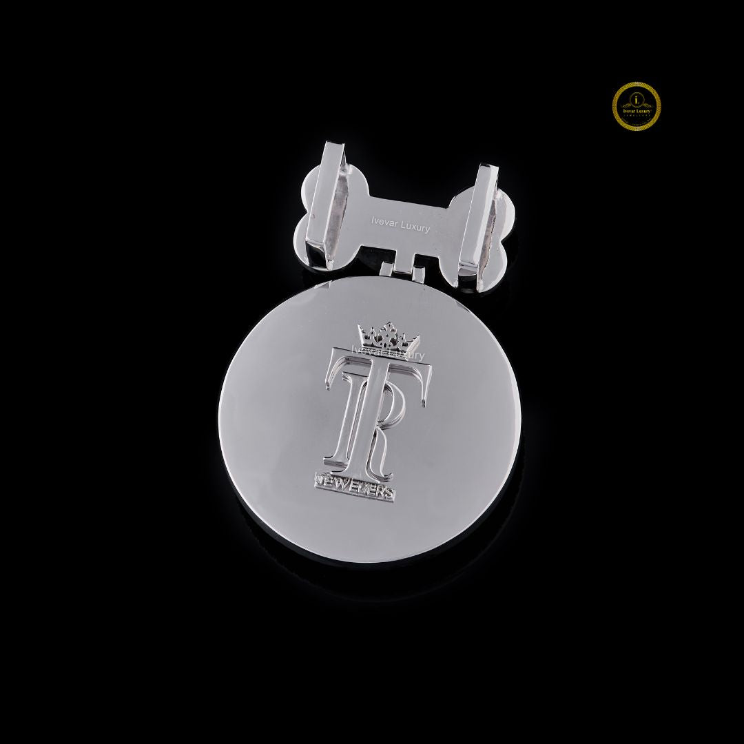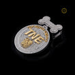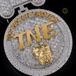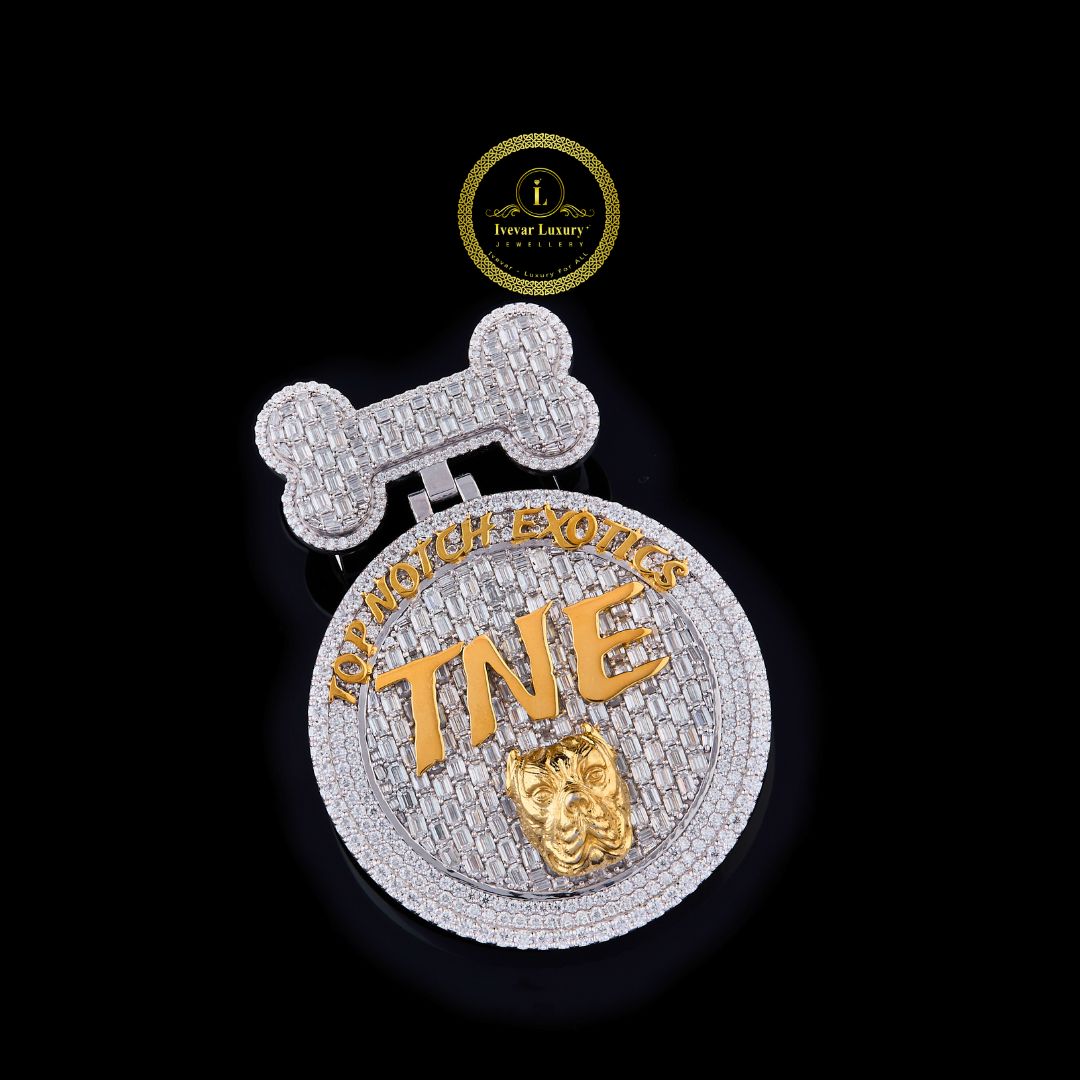 This moissanite diamond pendant is a bold piece, likely representing a brand or group based on the text. The main circular medallion is heavily iced out with moissanite stones, predominantly using baguette cuts in the center and a surrounding border of smaller round brilliant cuts. The design incorporates contrasting yellow gold accents for high visibility. These accents include the initials "TNE" and the full name "TOP NOTCH EXOTICS" in raised script around the border, along with a detailed dog or bulldog face in the center. The oversized bail is shaped like a dog bone, also completely covered in baguette-cut moissanite, adding a distinctive and cohesive theme to the entire piece. The jewelry is associated with the brand "Ivear Luxury."