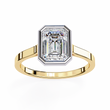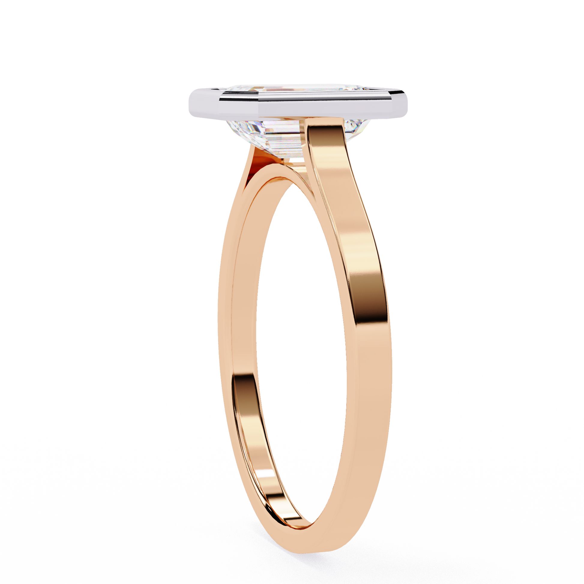 This sophisticated ring features a striking emerald-cut diamond showcased within a bold geometric bezel setting that highlights the stone’s crisp facets and exceptional clarity. The contrast of the bezel against the warm band creates a stunning, modern aesthetic. Designed for those who appreciate minimalist elegance, precision craftsmanship, and luxury jewelry that makes a refined statement.