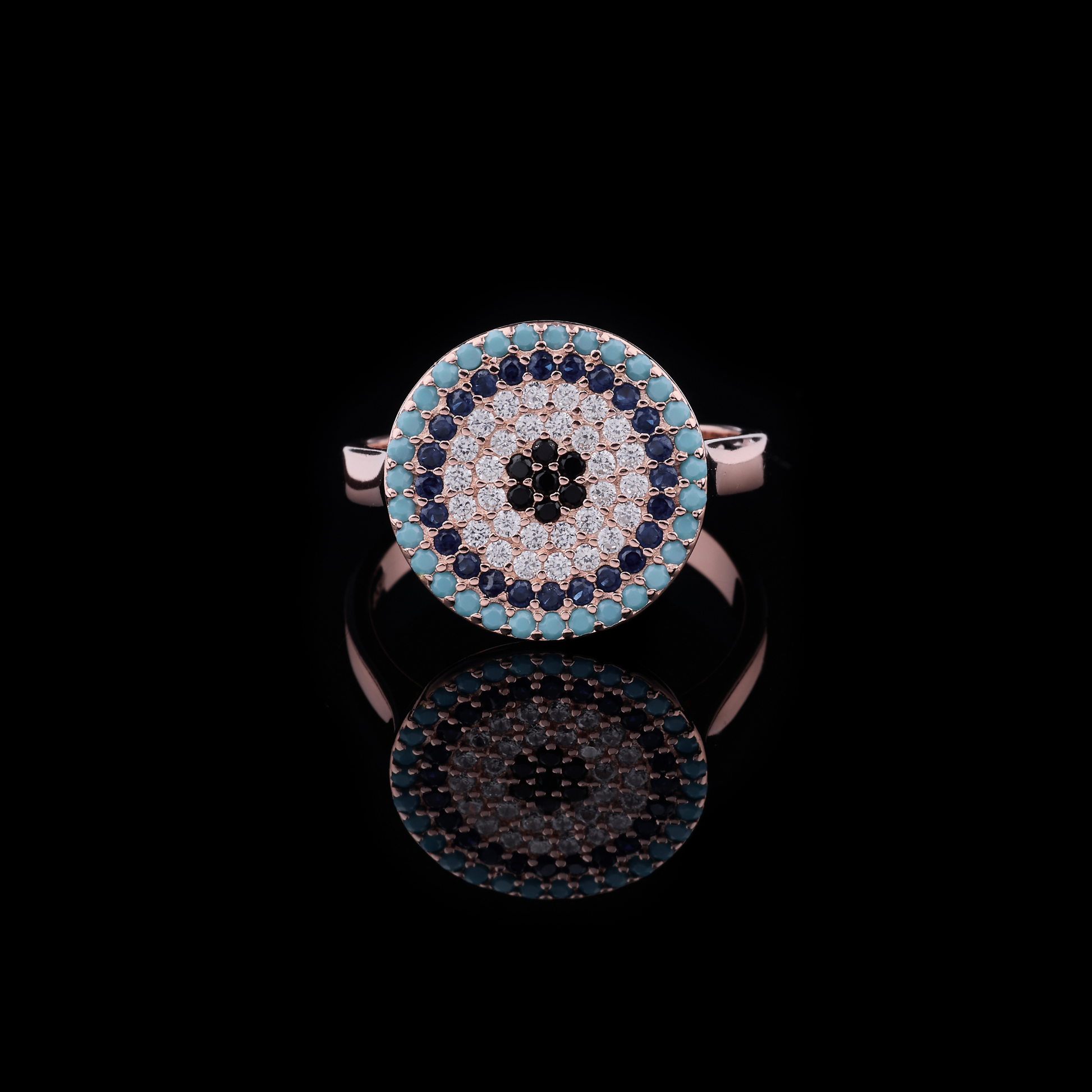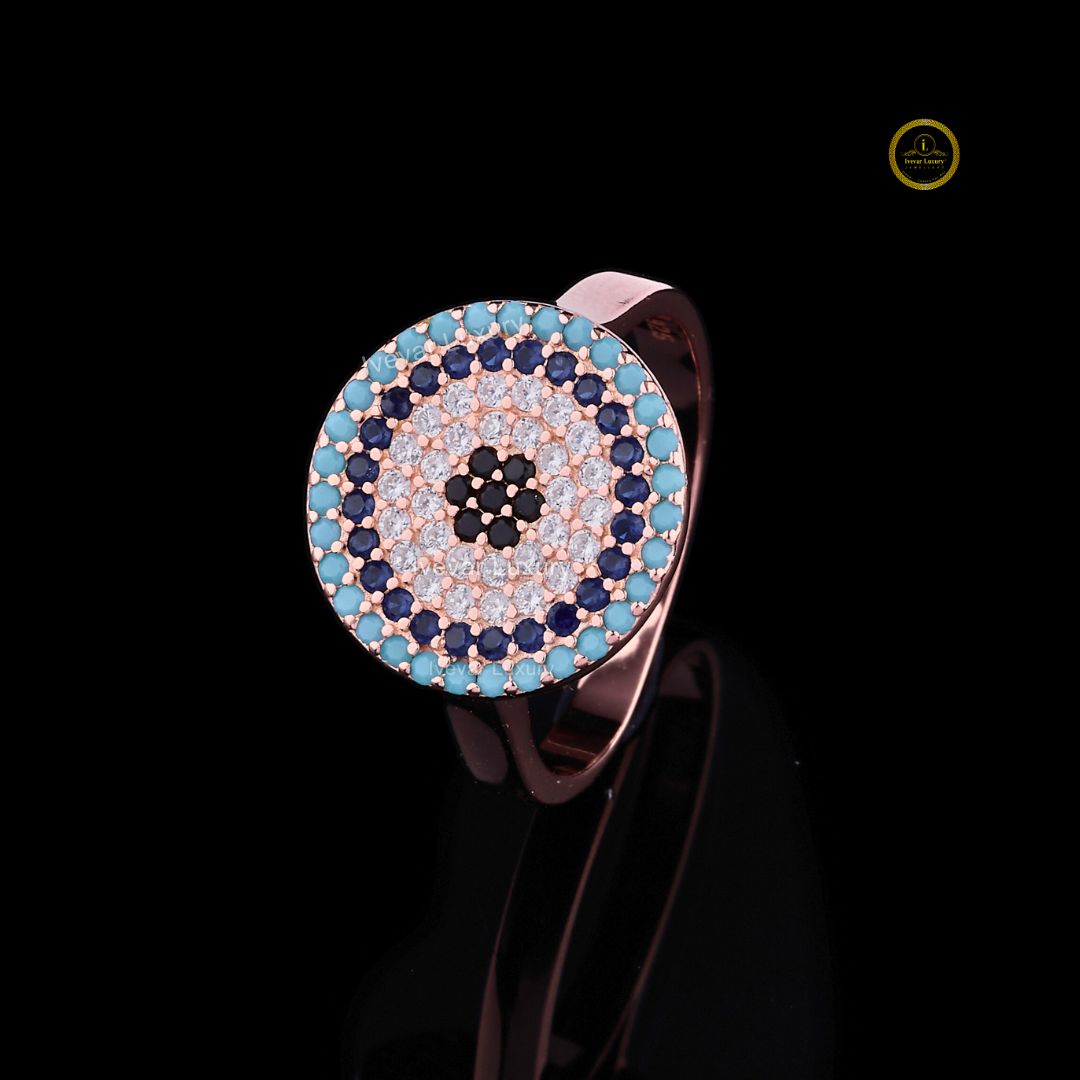 This Premium evil eye ring features a mesmerizing circular design adorned with vibrant turquoise, deep blue, and sparkling round-cut white stones. Set in rose gold, the ring symbolizes protection, positivity, and strength. Its intricate craftsmanship and colorful gemstone arrangement create a captivating centerpiece that blends modern elegance with timeless symbolism — perfect for those who embrace style with meaning.