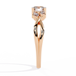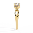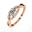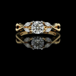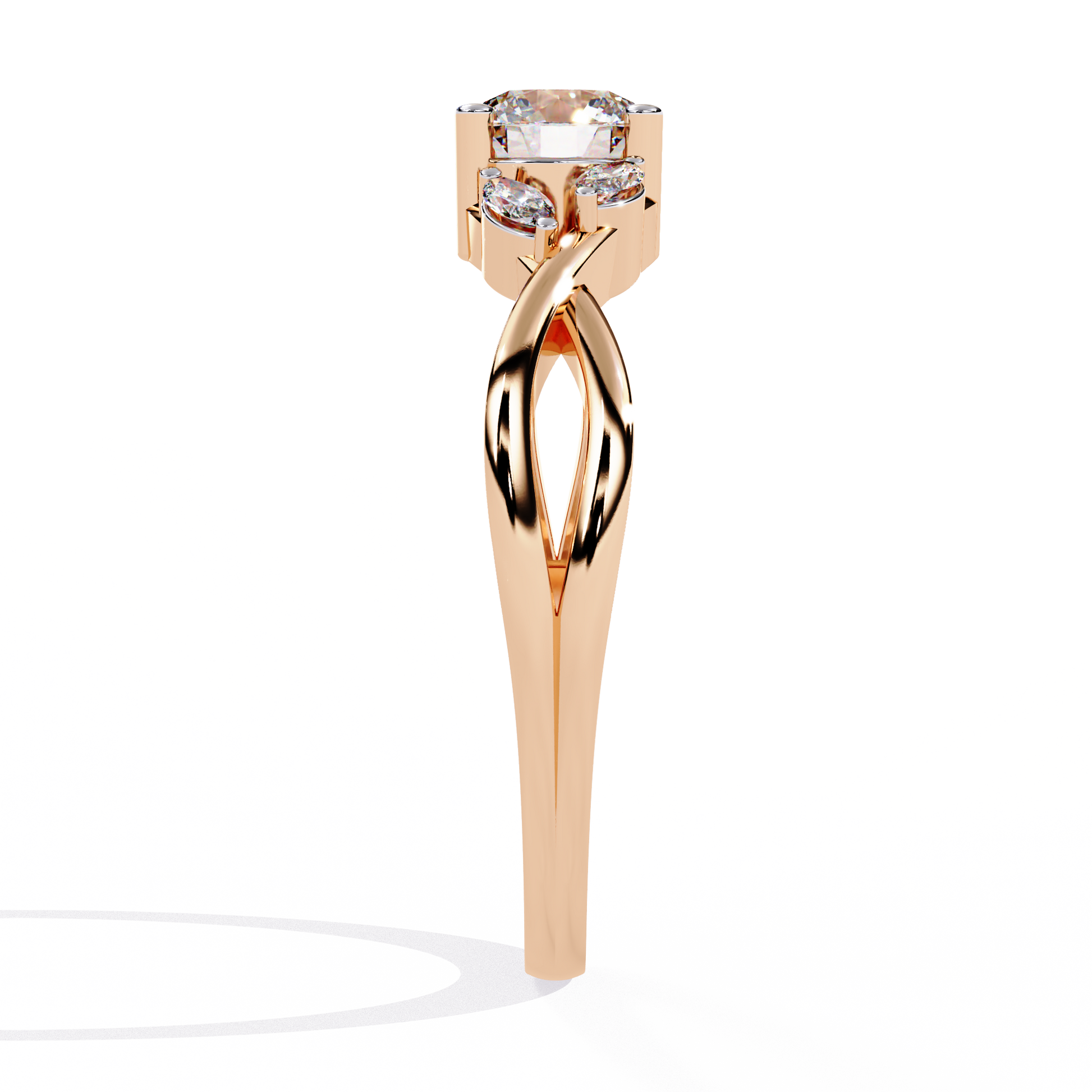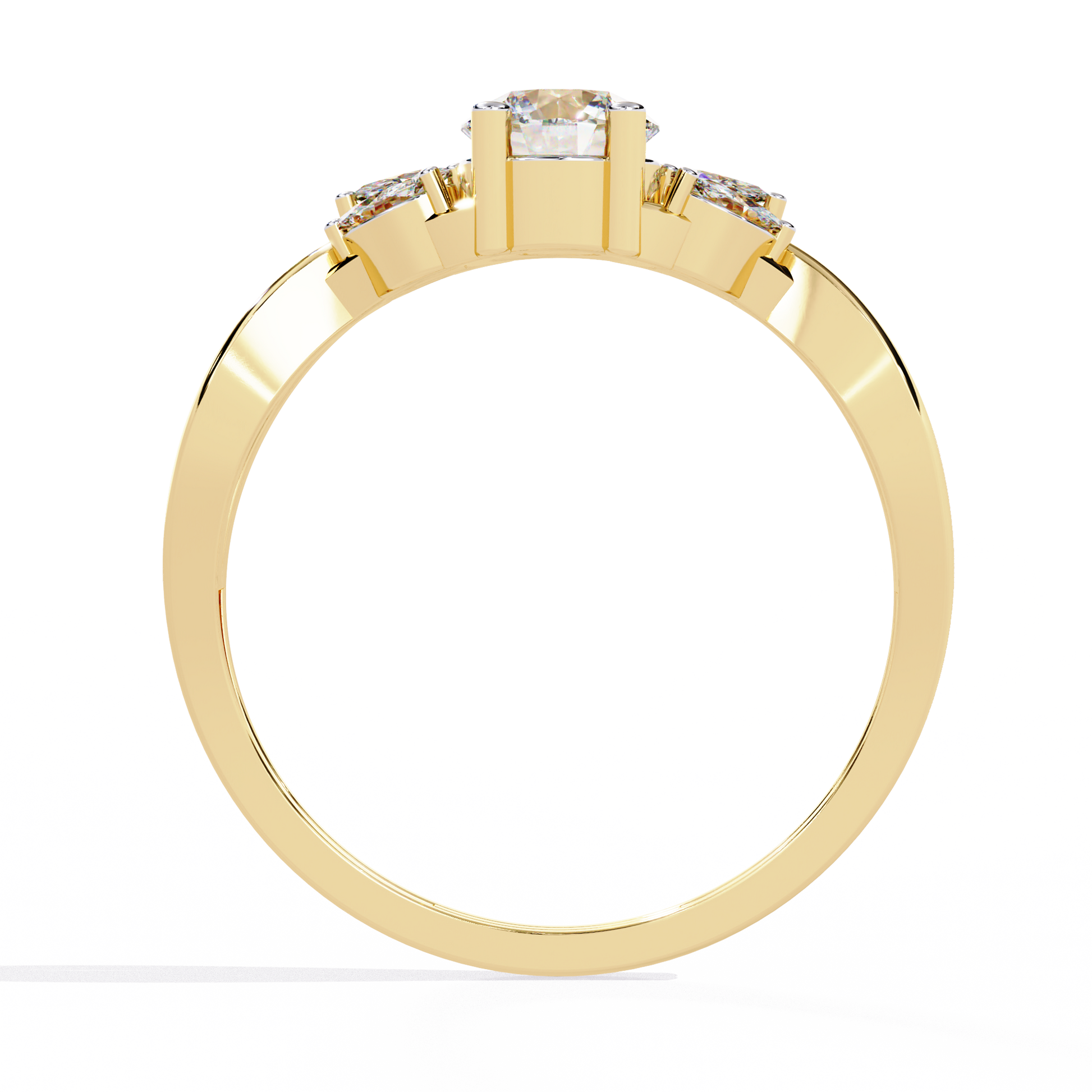 This stunning engagement ring features a brilliant round-cut center diamond set in a polished gold ring. The design incorporates delicate infinity-shaped twists on each side, accented with marquise-cut diamonds that enhance the ring’s sparkle and elegance. Its reflective presentation adds a luxurious touch, making it a perfect symbol of everlasting love and refined craftsmanship.