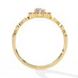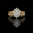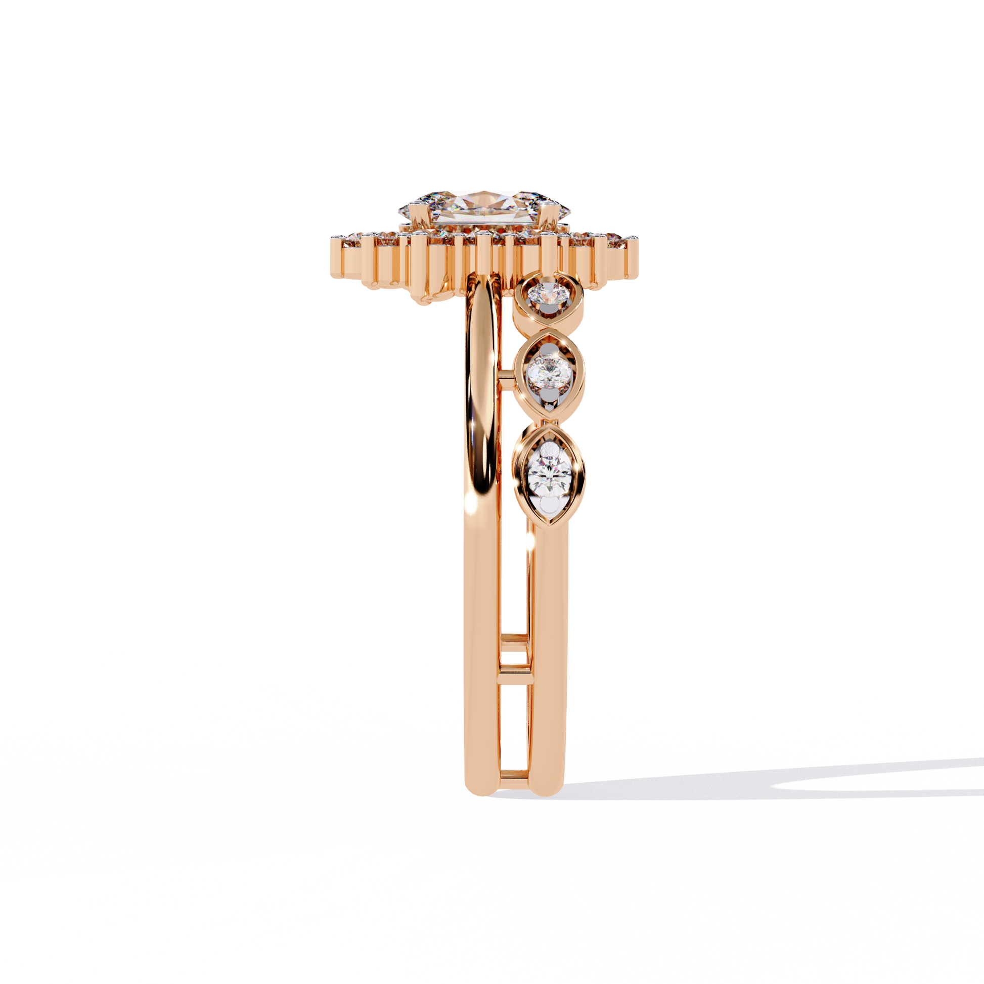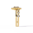This stunning ring features an elegant oval-cut center diamond encircled by a radiant halo of perfectly arranged round diamonds, creating a floral-inspired burst of brilliance. Set in a warm gold band adorned with bezel-set accent diamonds, it blends vintage charm with modern sophistication. From Ivevar's collection harmonious combination of intricate detailing and luminous sparkle makes this piece a captivating symbol of timeless elegance and refined luxury by Ivevar.