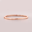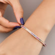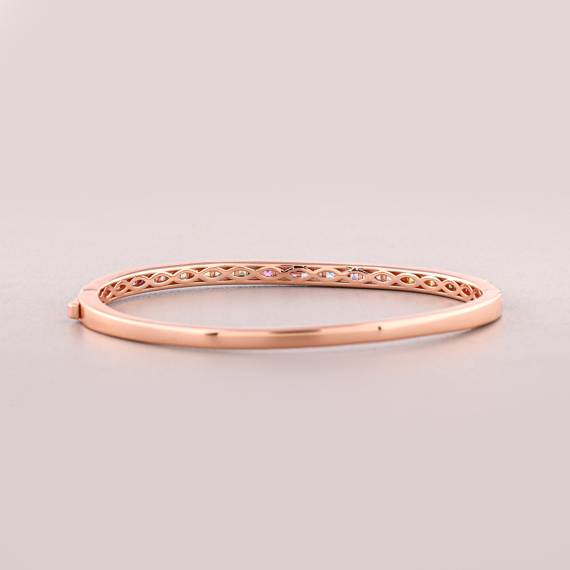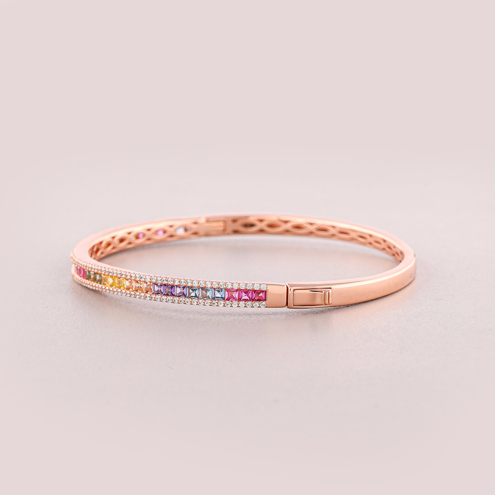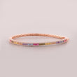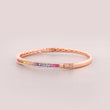 The bracelet is crafted in rose gold (indicated by the warm hue of the metal) and features a fine, delicate halo or border of tiny, round-cut white diamonds flanking the colored gems. This white diamond accent enhances the brilliance and contrast of the central rainbow row. The design of the metal band itself is open or filigree on the sides, adding lightness and intricate detail. It's a sophisticated, colorful piece perfect for adding a luxurious splash of color to any ensemble.