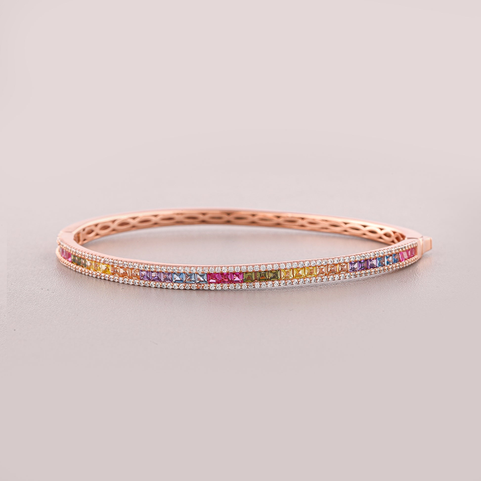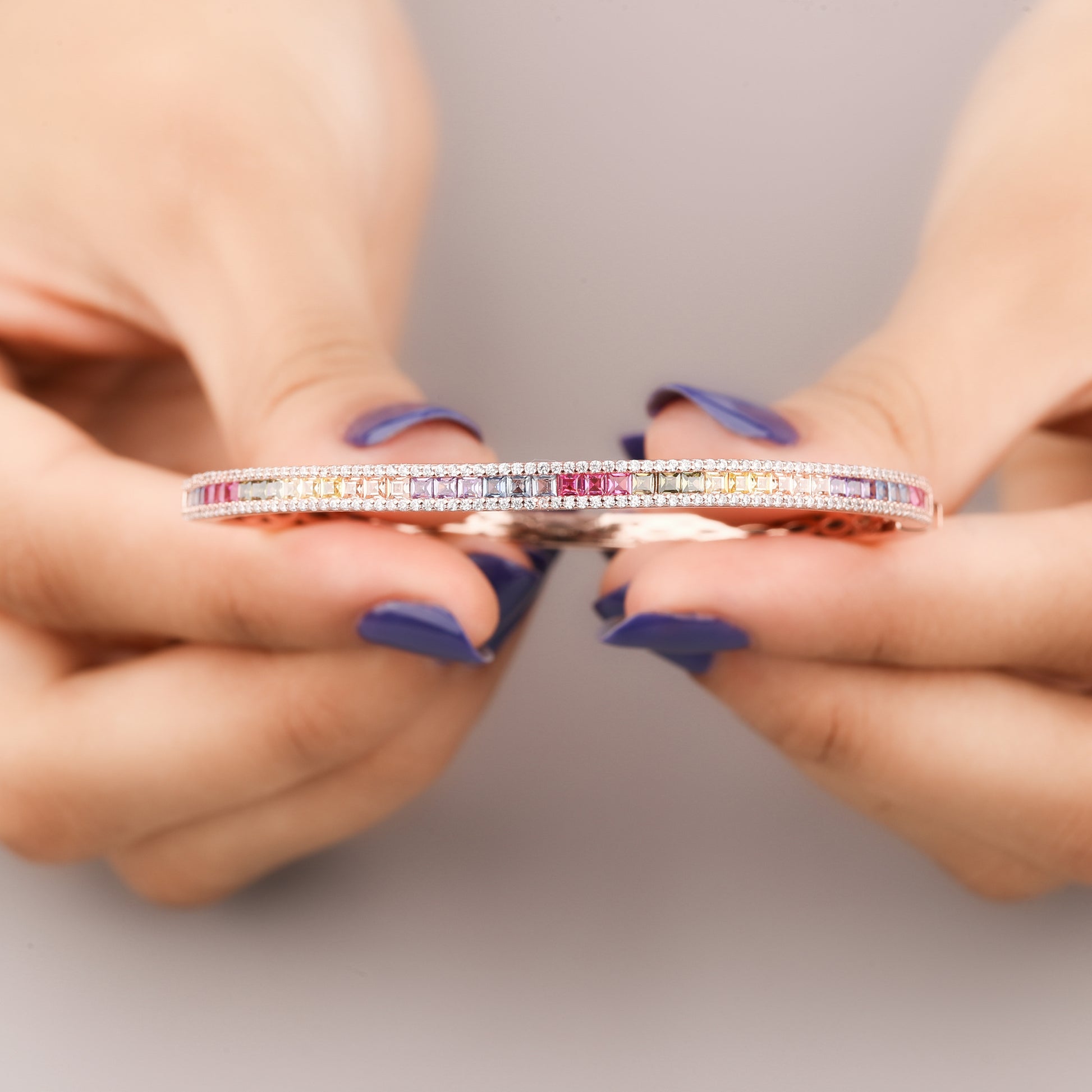 This elegant hinged bangle bracelet features a striking row of natural, multi-colored sapphires cut in a princess or square shape, creating a vivid "rainbow" effect around the wrist. The stones display a beautiful gradient of colors, including reds, oranges, yellows, greens, blues, and pinks.