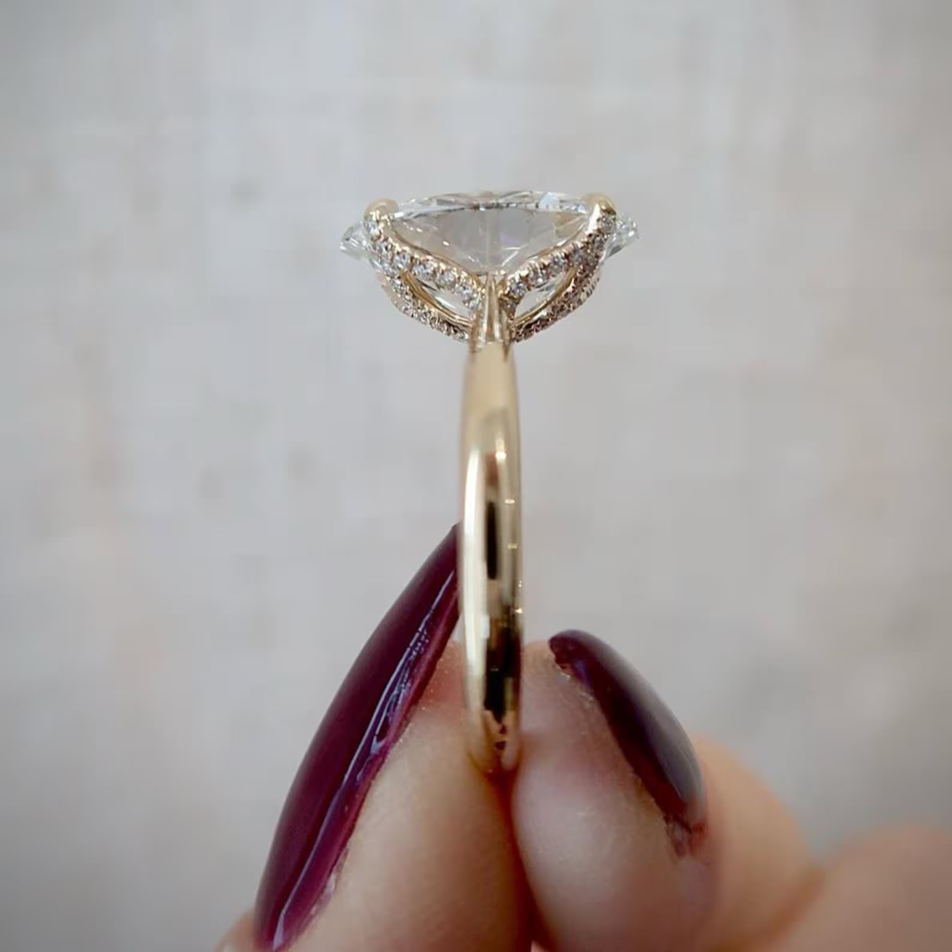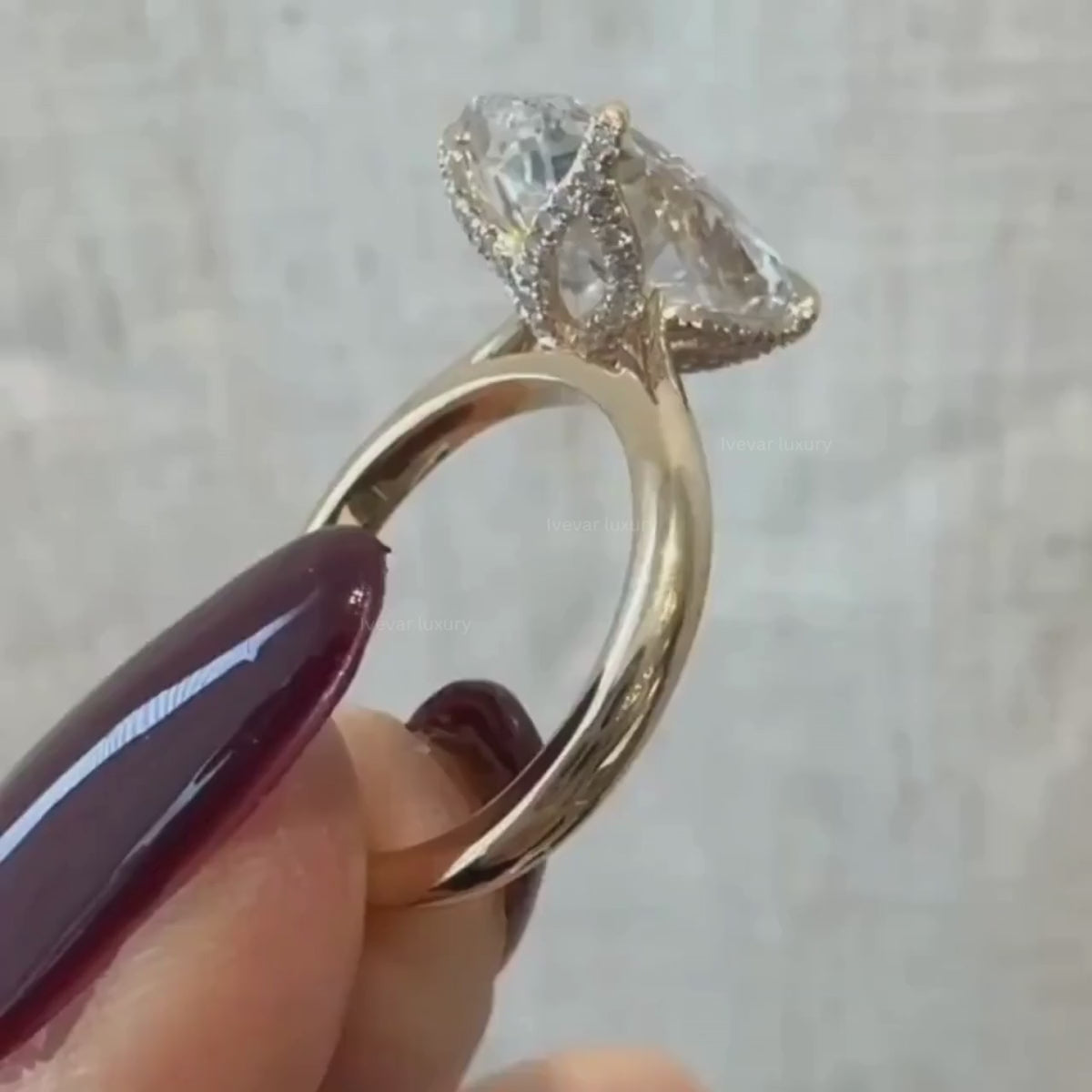 This stunning engagement ring features a captivating oval-cut center diamond secured in a refined prong setting that maximizes brilliance and elegance. Beneath the center stone, a delicate hidden halo of round diamonds enhances sparkle from every angle, while the intricately designed pave diamond gallery adds depth and luxurious detail to the profile. Designed for those who appreciate refined luxury, Ivevar Luxury delivers exceptional quality and enduring beauty in this elegant engagement ring.