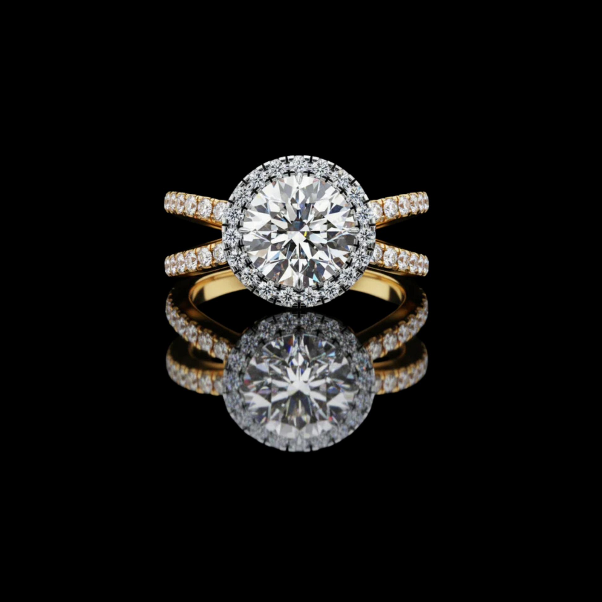 This stunning ring features a dazzling round-cut central diamond surrounded by a sparkling halo of smaller diamonds, enhancing its brilliance and fire. The band is uniquely designed with a graceful crisscross pattern, each strand adorned with a row of shimmering diamonds, adding depth and sophistication. Crafted in polished gold, this ring effortlessly combines classic elegance with modern flair, making it a perfect statement piece for those who appreciate luxury and timeless beauty by Ivevar.