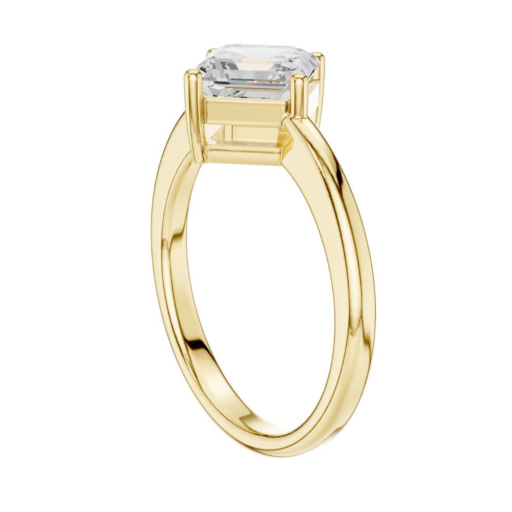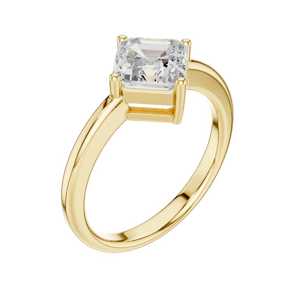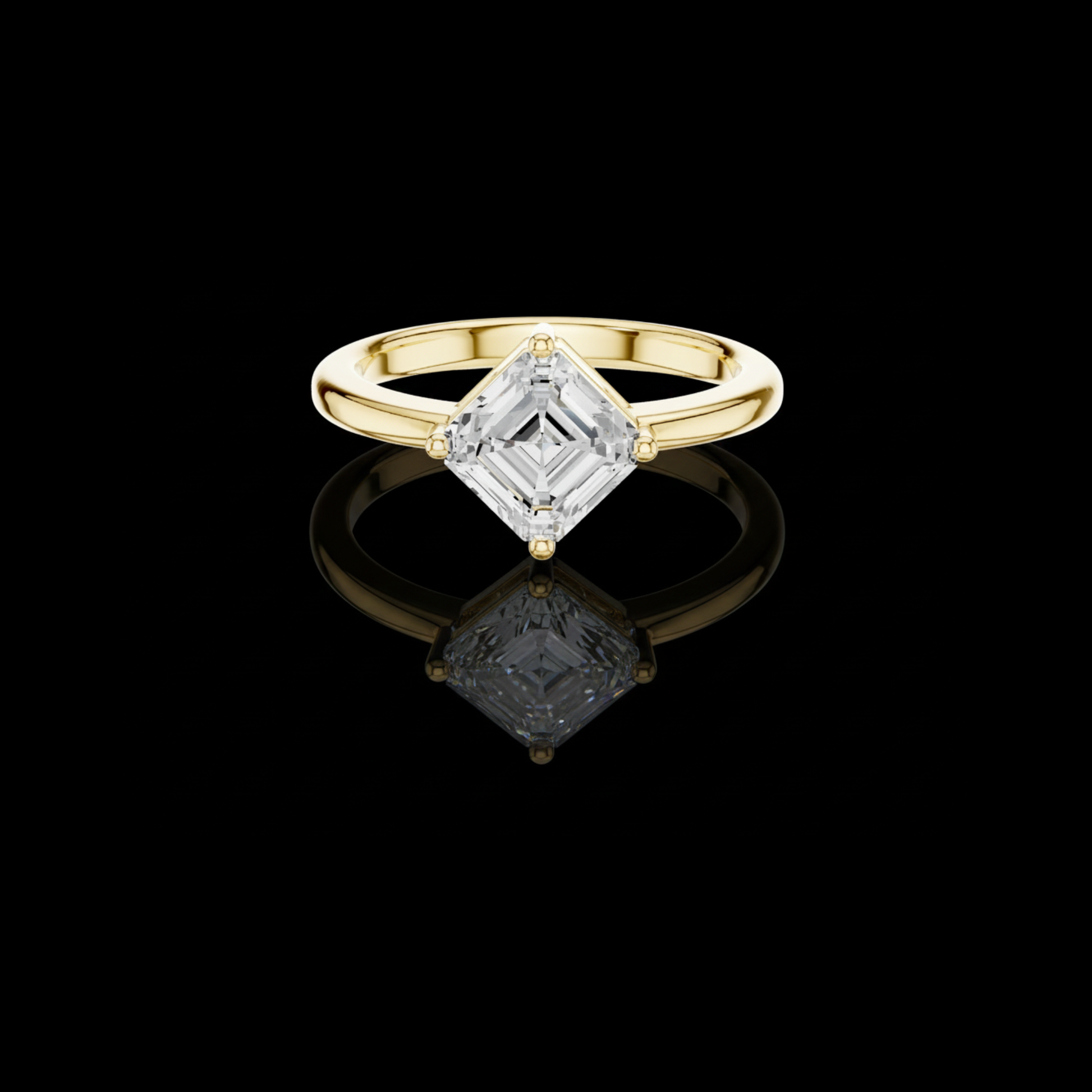 This sophisticated engagement ring features a stunning emerald square-cut diamond set in a sleek four-prong design, rotated for a distinctive geometric look. The clean, step-cut facets of the diamond create a mesmerizing hall-of-mirrors effect, beautifully complemented by the warm glow of the polished gold band. Modern yet timeless, this ring blends classic craftsmanship with bold symmetry, making it a perfect statement of refined elegance.