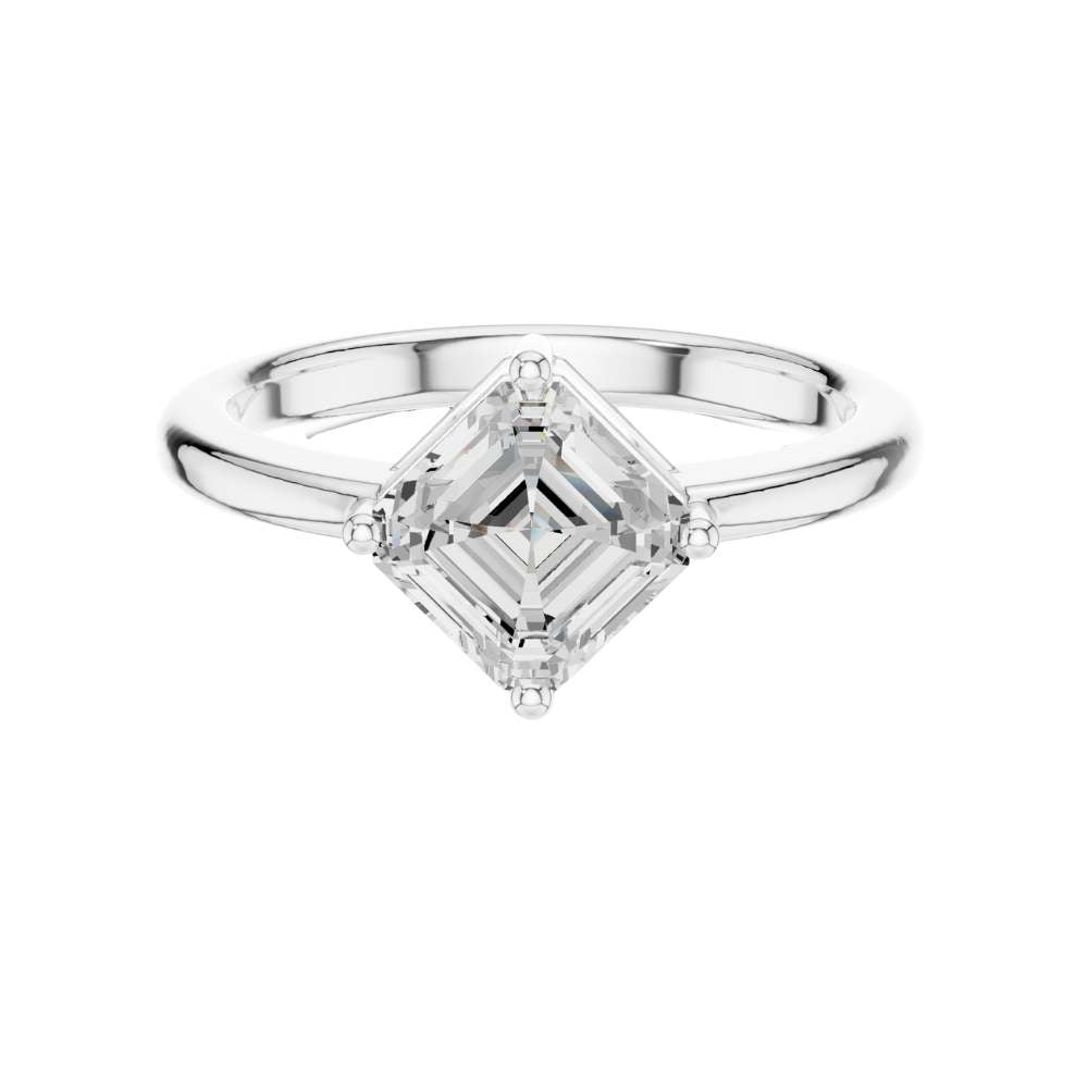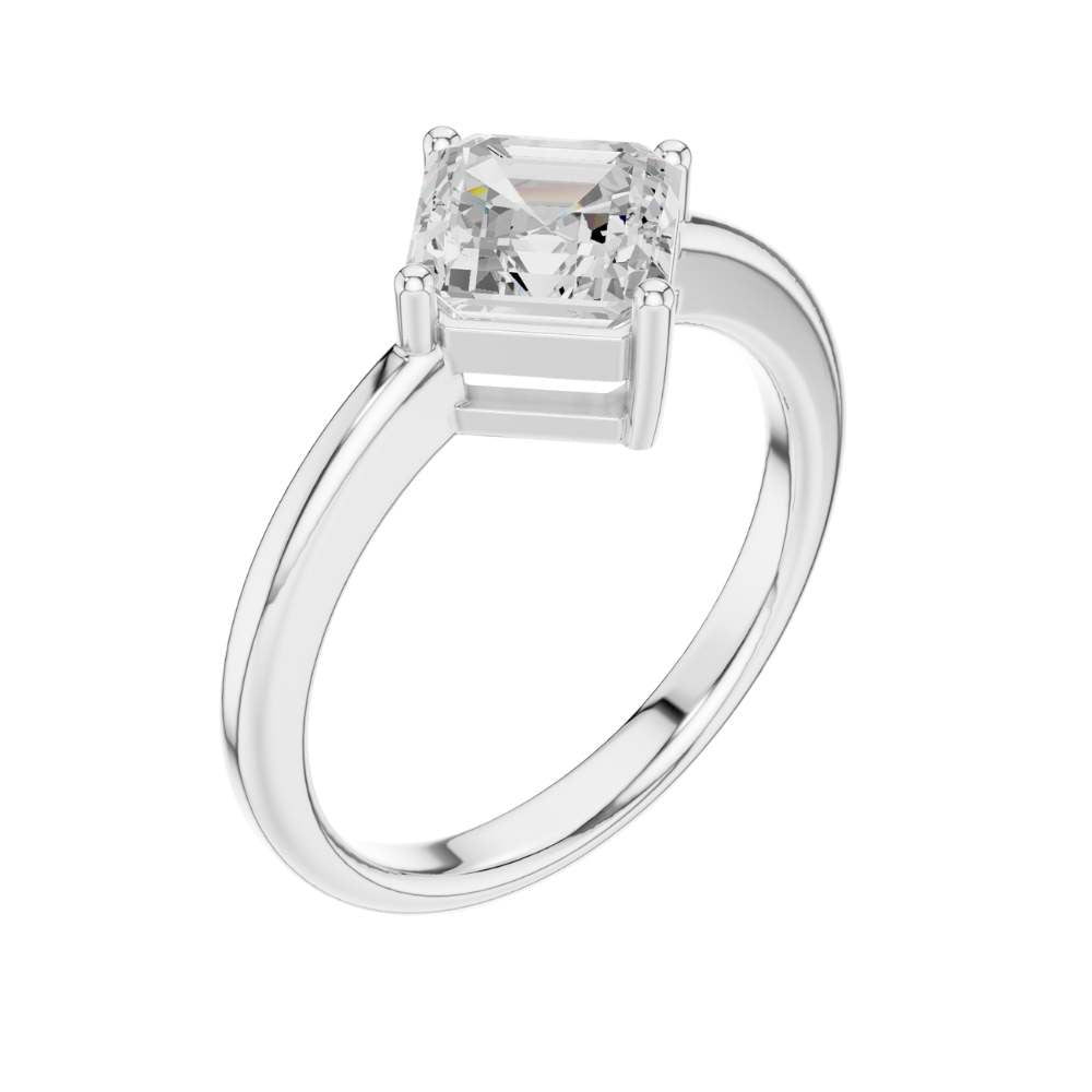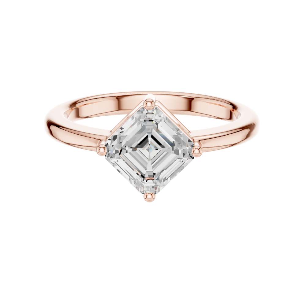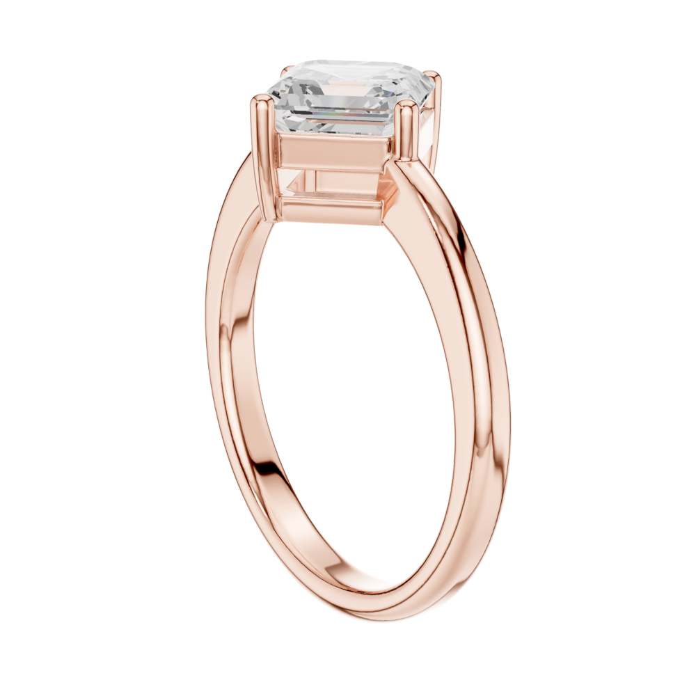 This sophisticated engagement ring features a stunning emerald square-cut diamond set in a sleek four-prong design, rotated for a distinctive geometric look. The clean, step-cut facets of the diamond create a mesmerizing hall-of-mirrors effect, beautifully complemented by the warm glow of the polished gold band. Modern yet timeless, this ring blends classic craftsmanship with bold symmetry, making it a perfect statement of refined elegance.