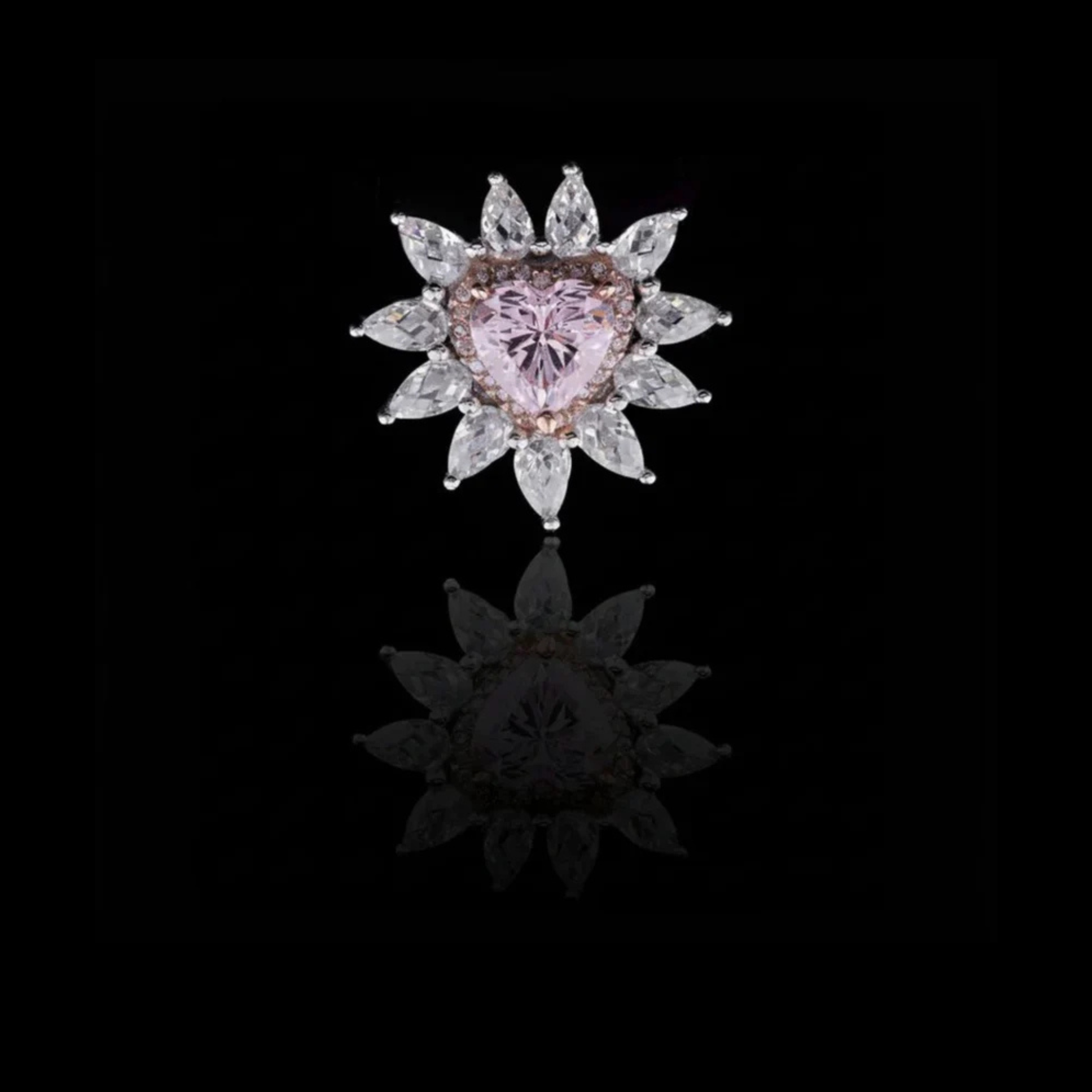 This exquisite ring is a true statement of elegance and artistry. At its center rests a breathtaking heart-cut pink gemstone, shimmering with soft romantic brilliance. Surrounding it is a radiant halo of pear & Round-cut diamonds arranged in a floral, sunburst-like pattern, creating a stunning blossom effect. Each stone is meticulously set to maximize light reflection and add depth, giving the piece a luxurious, high-end sparkle.